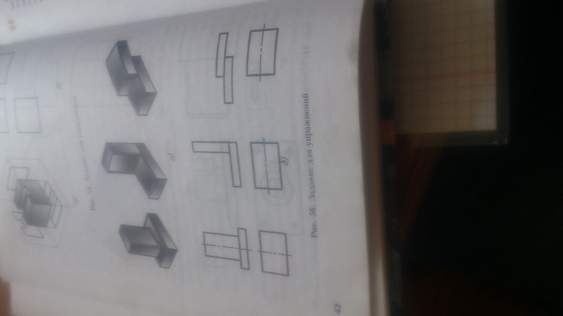 на рисунке 56, а даны наглядные изображения моделей, составленных из двух спичичных коробков. На рисунке 56, б даны соответствующие им проекции моделей: фронтальная и горизонтальная. На горизонтальных проекциях дано изображение лишь одной коробки, изображение второй отсутствует. Перечертите в тетр. данные на рисунке 56, б чертежи и дополните их изображением второй коробки