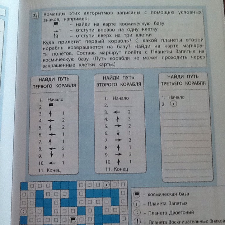 видите стрелочки Вот они указывают флажку а это корабль Вот и проложи маршрут на на третьем столбике кораблю как показано ниже понятно