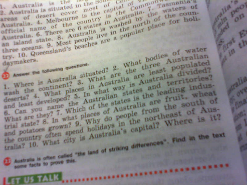 1)Australia situated in Oceania between the Indian Ocean and the South Pacific Ocean.2) It is washed by: - the Pacific Ocean - the Indian Ocean.3) The largest three are - Great Victoria Desert, Great Sandy Desert, Tanami Desert. 4) Queensland's beaches are popular. 5)There are six states in Australia: New South Wales (NSW), Queensland (Qld), South Australia (SA), Tasmania (Tas.), Victoria (Vic.) and Western Australia (WA). Two mainland territories, The Australian Capital Territory (ACT) and The Northern Territory (NT) and one offshore territory, Norfolk Island, have been granted a limited right of self-government by the Australian Government.