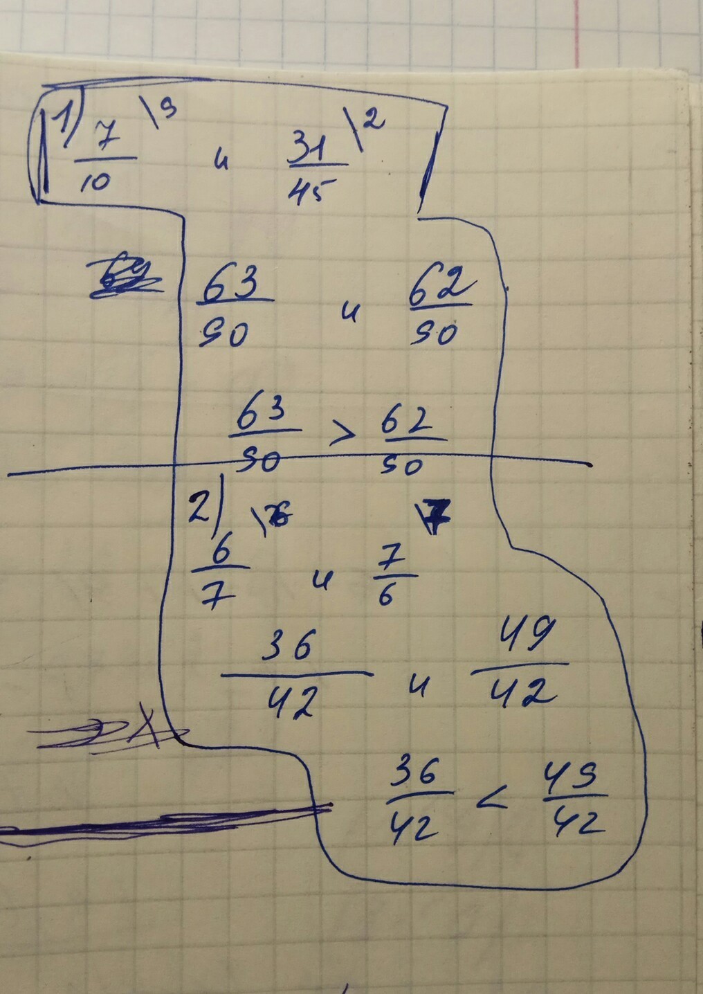 чтобы решать подобные задачи тебе всего лишь Нужно привести к одному знаменателю вот и всё дальше числа сами себя покажут и можно будет ставить знаки больше меньше или равно в твоём случае в первом будет Первое больше второго а во втором первое меньше второго Надеюсь помогла тебе