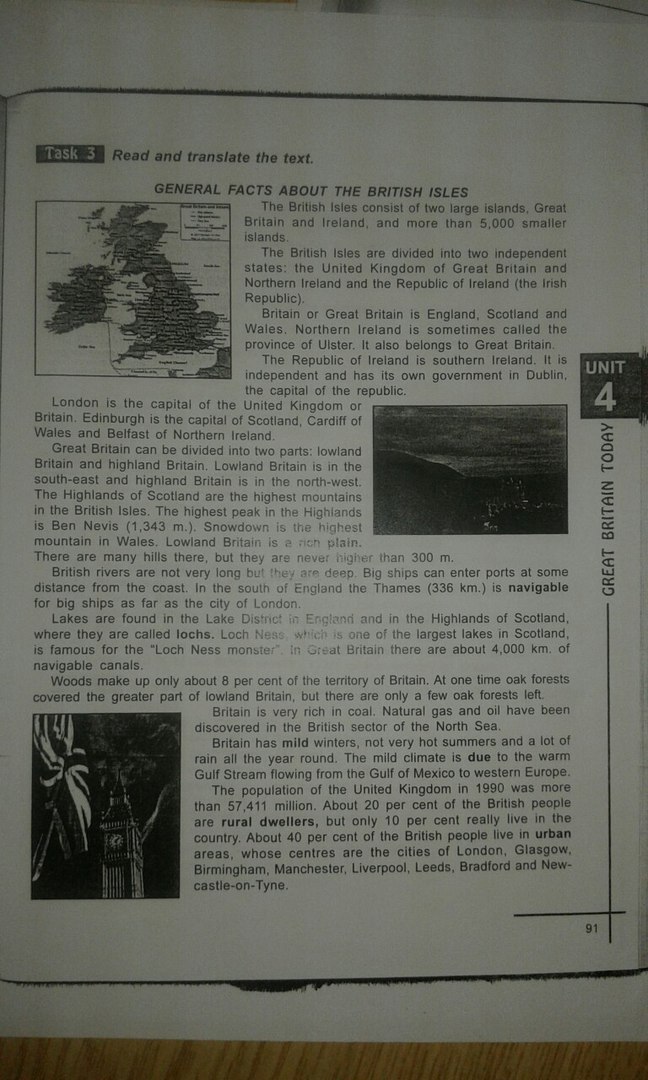 Великобритания может быть разделена на две части: низменности Британии и нагорье Британии. Низменности на юго-востоке, Нагорье на северо-западе. Нагорья Британии самые высокие горы на Британских островах. Самый высокий пик в Нагорье Бен Нэвис (1343м). Сноуден самая высокая гора в Уэльсе. Низменность это богатая равнина. Там много холмов, но они никогда не выше 300 метров.