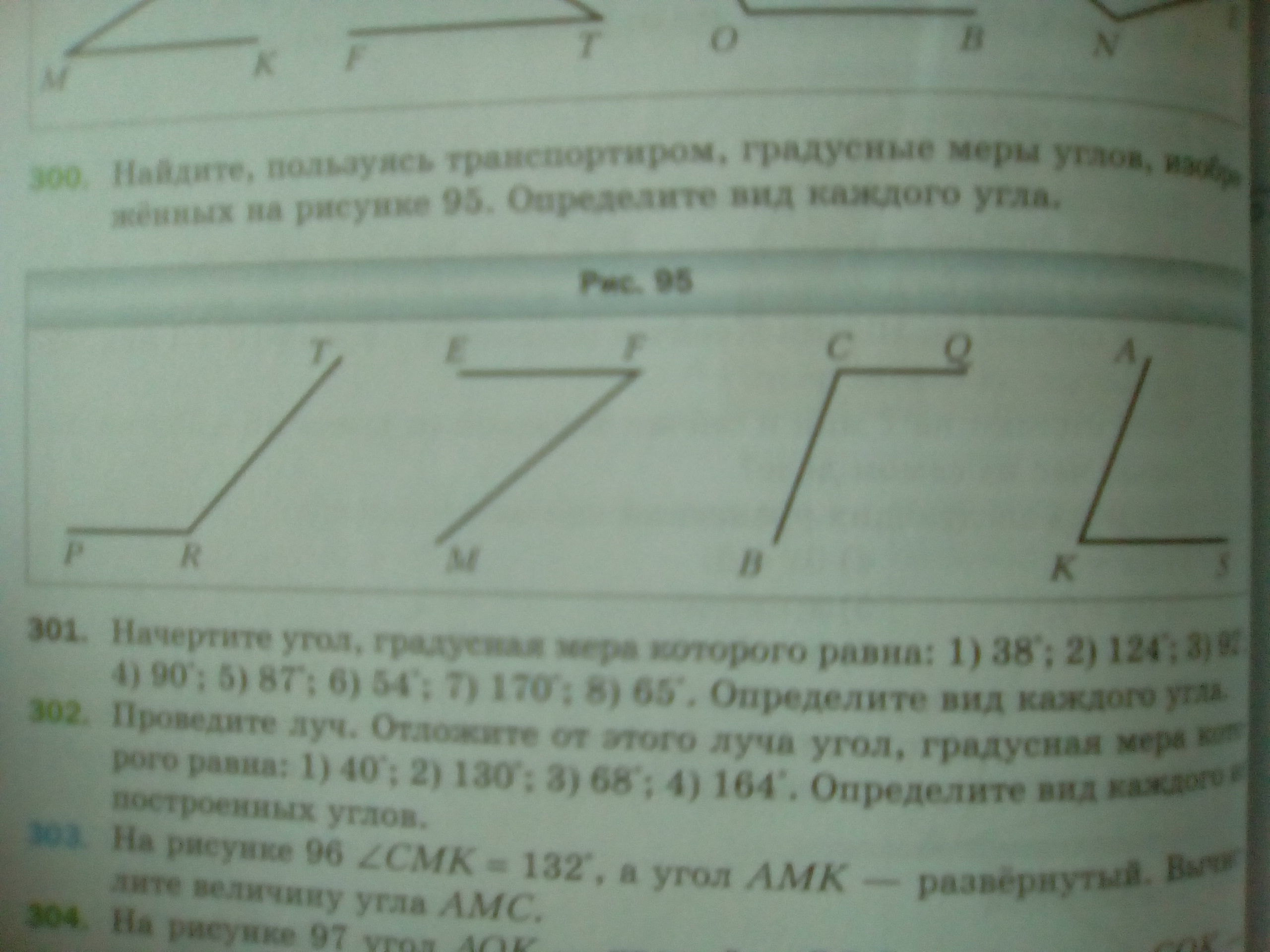 Найдите, пользуясь транспортиром, градусные меры углов, изображенных на рисунке 95. Определите вид каждого угла.