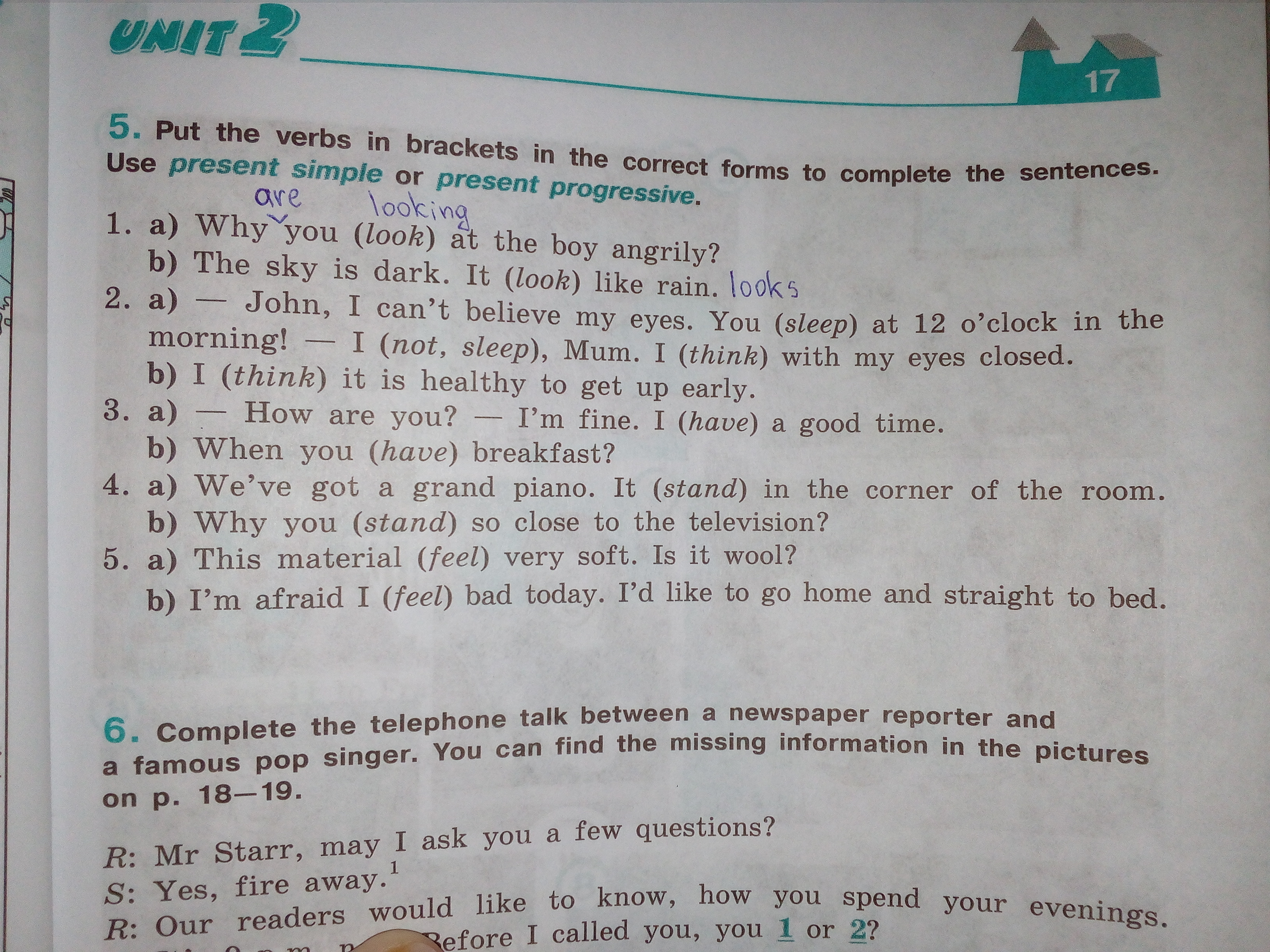 1 are you looking 2 are sleeping, am not sleeping am thinking 3 am having, do you have 4 stands, are you standing 5 feels, feel/am feeling - оба варианта