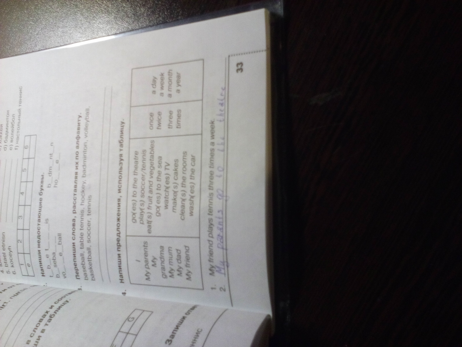 I go to the theater twice a month. My parents eat fruits and vegetables once a day. My grandma watches TV three times a day. My mum makes cakes twice a month. My dad washes the car twice a month. My friend cleans the rooms once a week. I go to the sea once a year. My friend play soccer twice a day.