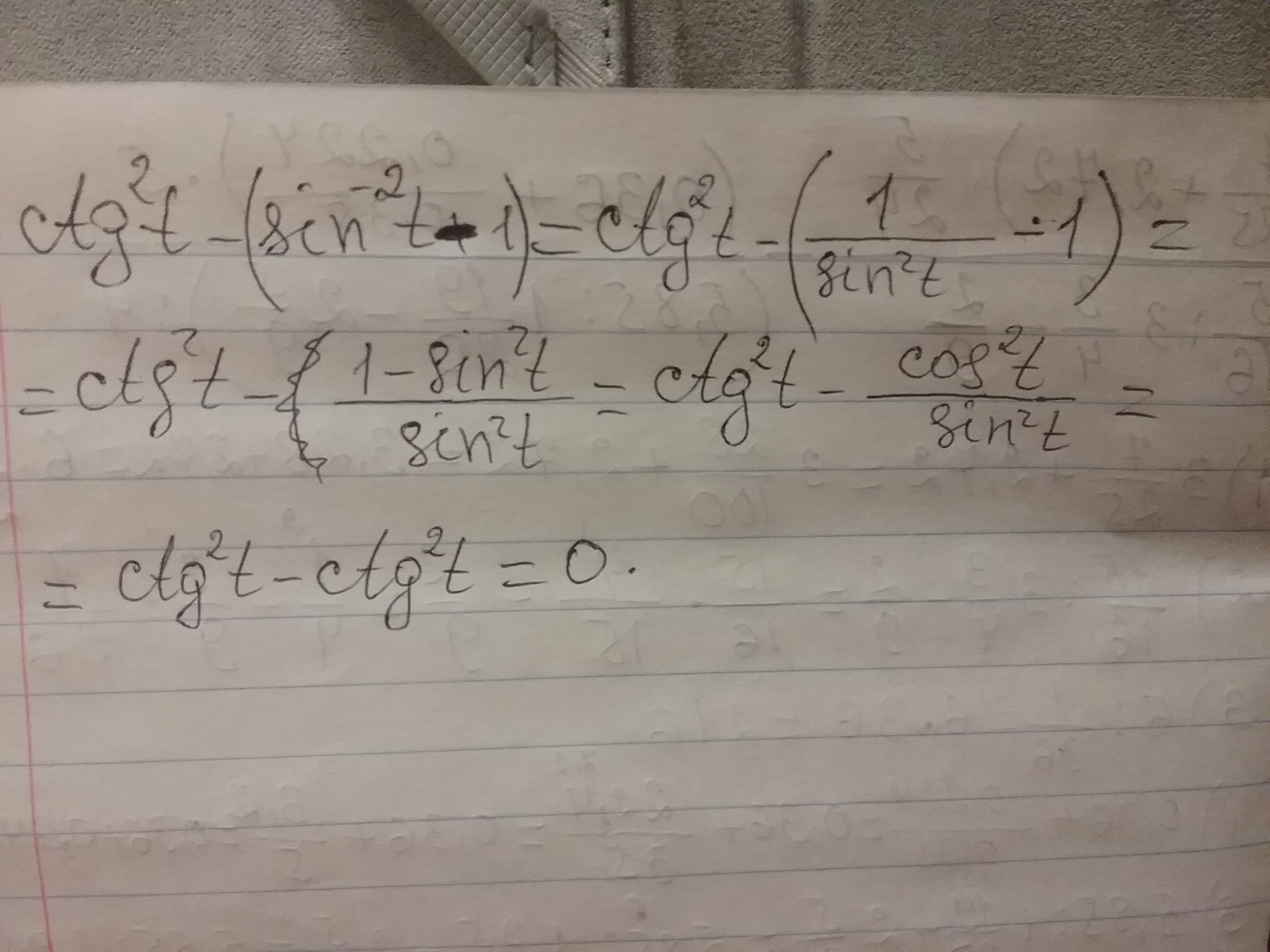 ctg^2t-(1/sin^2t -1)=ctg^2t-ctg^2t= 0
