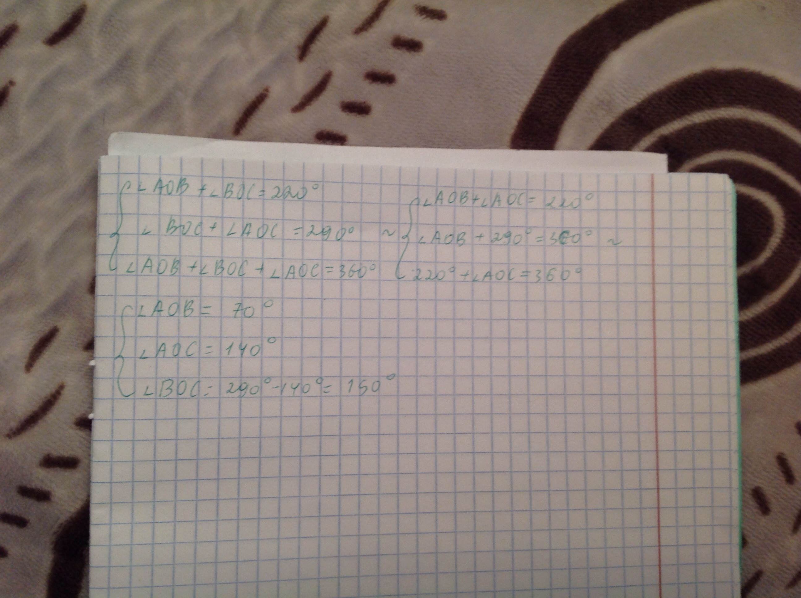 на рисунке 3.25 изображен полный угол,вершиной которого является точка О - центр круга. он разделен на углы АОВ,ВОС и АОС. угол АОВ+угол ВОС =220° угол ВОС +угол АОС=290°