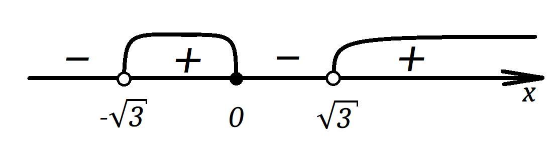 Отмечаем на координатной прямой точки, в которых выражения из числителя и знаменателя обращаются в ноль. И выкалываем те, что относятся к знаменателю (на ноль делить нельзя). Мы получили 4 интервала. Перед дробью знак положителен, поэтому на правом интервале ставим "плюс", далее чередуем знак через каждую отмеченную точку (нету чётных степеней, где знак может не измениться). Нас интересует, когда больше или равно нуля, поэтому выбираем интервалы с плюсом и учитываем их границы.