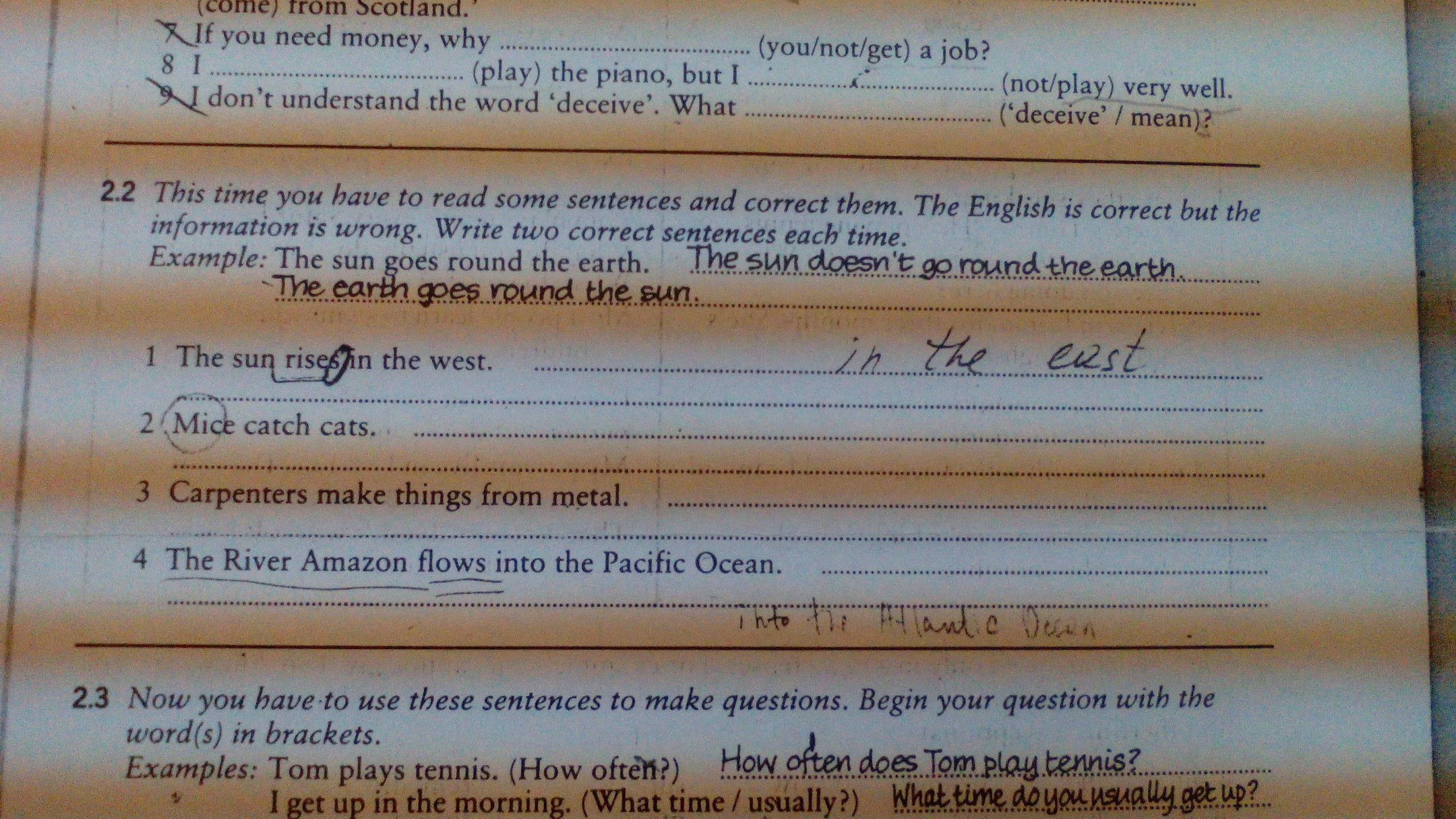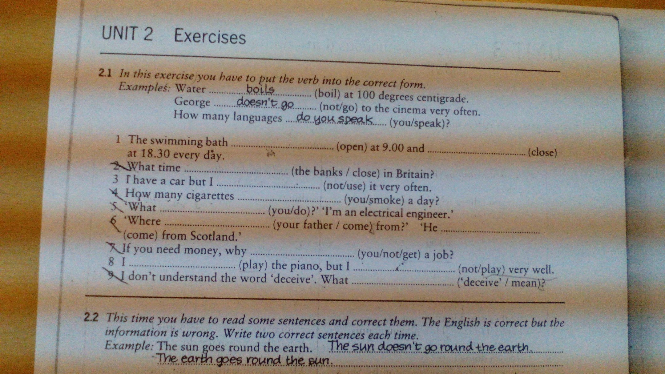 2.1. 1.opens; closes 2. do the banks close 3. don't use 4. do you smoke 5. do you do 6. does your father come; comes 7. don't you get 8. play; don't play 9. does "deceive" mean ?