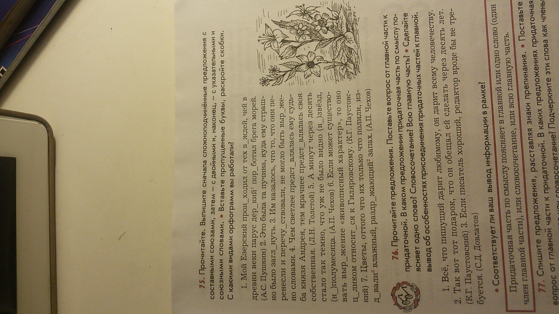 7. Цветы, оттого что их только что полили, издавали влажный, раздражающий запах. 4. Чем светлее представлялась ему судьба князя Андрея, тем мрачнее представлялась своя собственная. 5. А минут через десять стало так темно, что уж не было видно ни звезд, ни полумесяца. 6. Если может существовать выражение "живописный характер", то оно целиком относится к Гиляровскому. 1. Мой Езерский происходил от тех вождей, чей в древни веки парус дерзкий поработил брега морей. 2. Это была та пучина, куда ему страшно было заглянуть. 3. Им казалось, что то, что они перенесли и перечувствовали, не могло быть выражено словами.