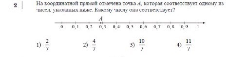 смотри, (•)А находится в промежутке от 0,2 до 0,3 значит точка число дробное , т.е. не целое. Варианты 3) и 4) сразу отбрасываем, так как они имеют целые части. точка А ближе к 0,3 значит выбираем из оставшихся вариантов ту дробь, которая больше - 4/7