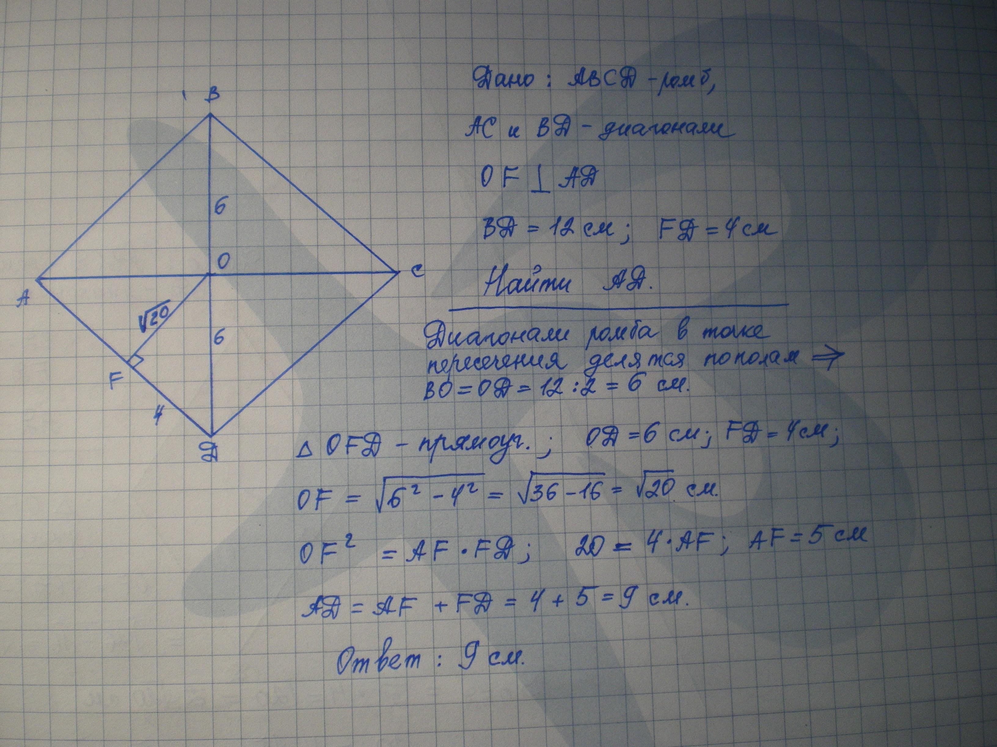 Диагонали ромба ABCD пересекаются в точке O.Отрезок OF-перпендикуляр,проведённый к стороне AD.Вычислите длину стороны ромба,если известно,что BD=12см,FD=4 см