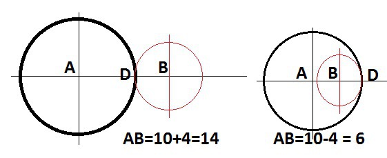 Имеют общую точку D. Диаметр окружности с центром в точке А равен 10 см, а деаметр окружности с центром в точке В 4 см. Найдите расстояние между их центрами. Как расположены эти две окружности относительно друг друга?