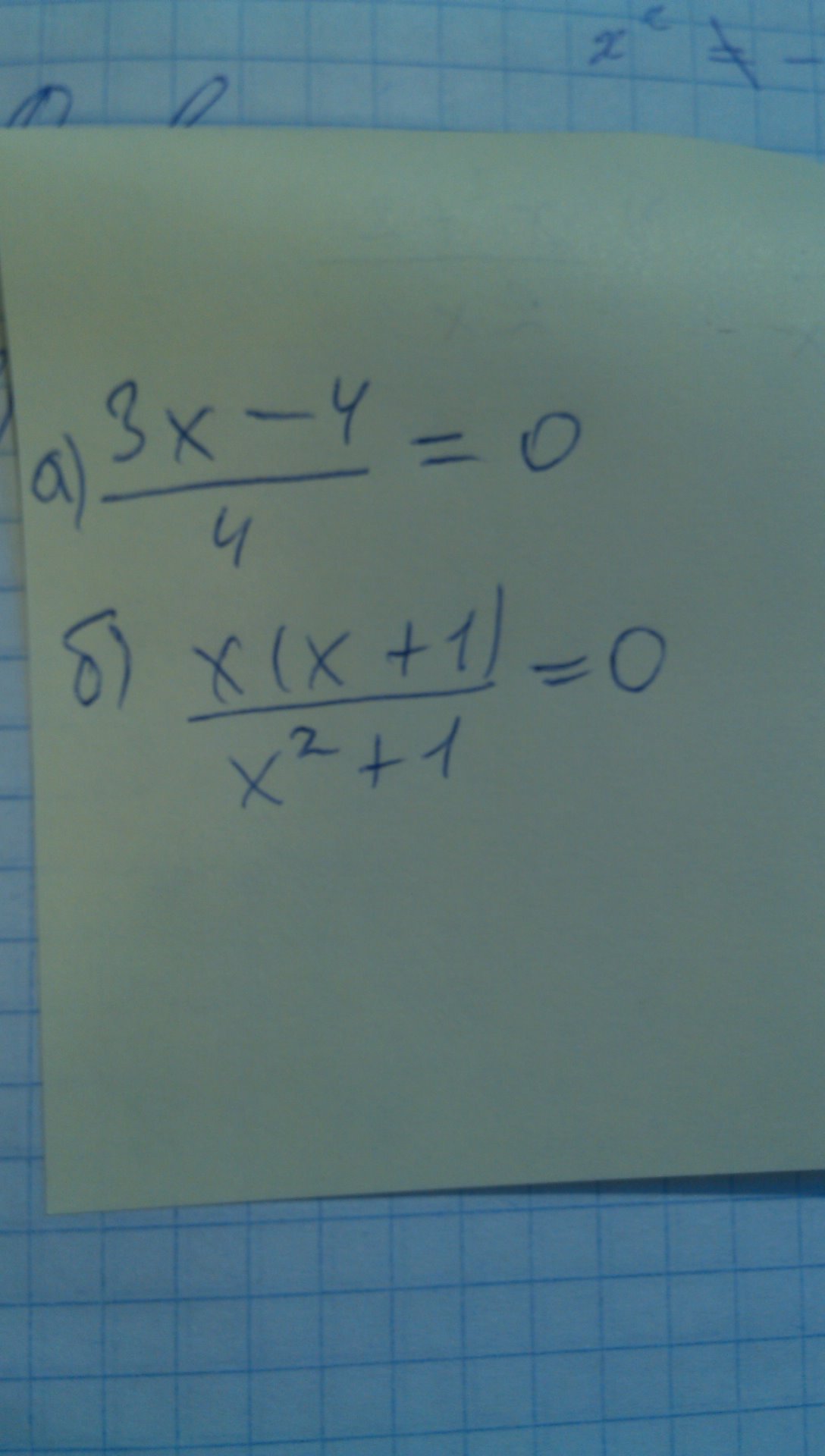 1) (3×-4)/4=0|*4 3×-4=0 3×=4 ×=4/3 ×=1 1/3 ×=1 целая 1/3 2) ×(×+1)/(×^2+1)=0 ×^2+1 не равен 0 ×^2 не равен 1 ×(×+1)=0 ×=0 или ×+1=0 ×=1 Ответ :×=0,×=1
