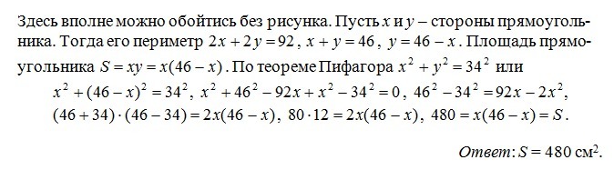 диагональ прямоугольного треугольника равна 34см,а его периметр 92 см найдите площадь прямоугольника