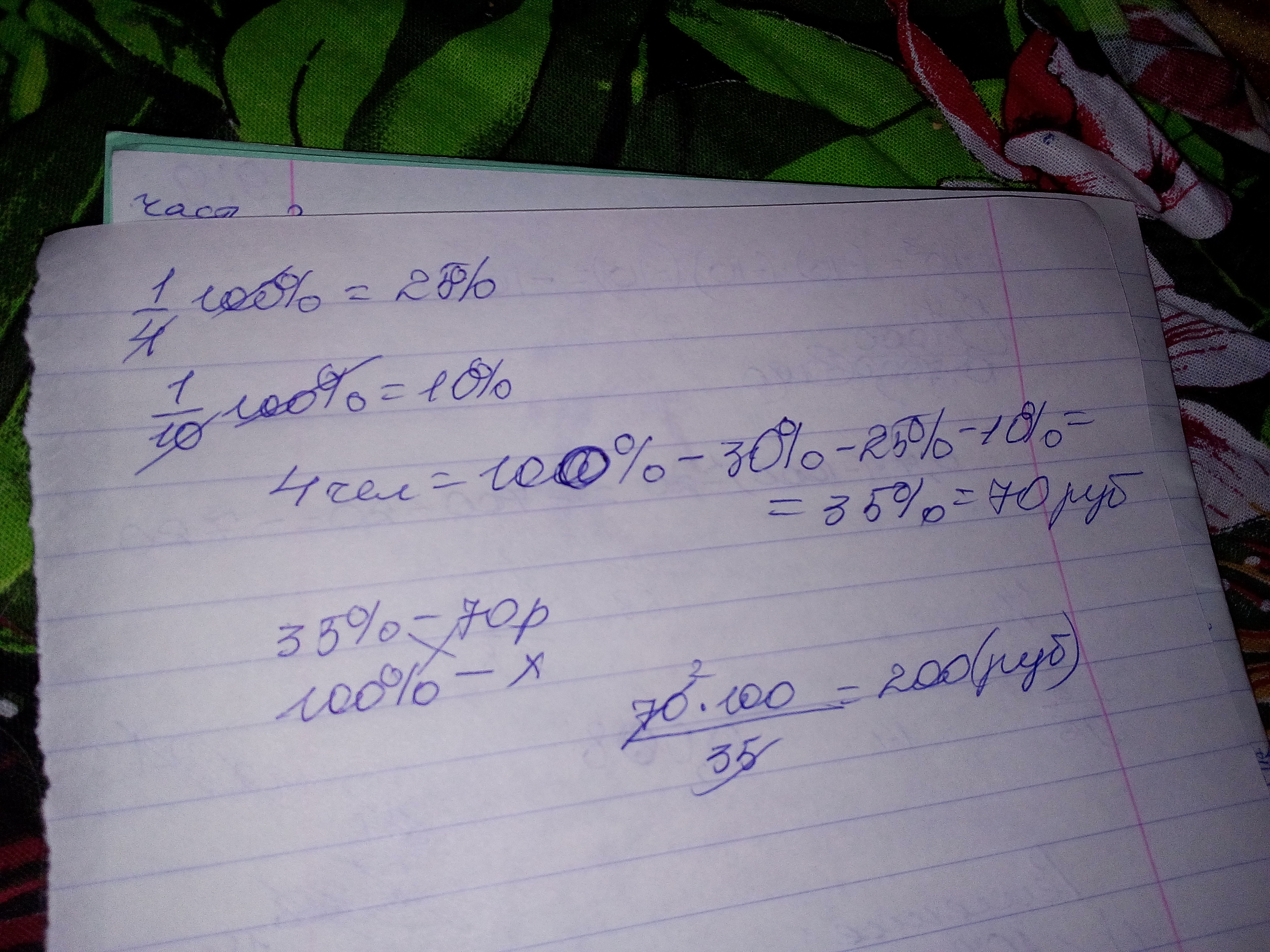 Четверо друзей покупают арбуз. Первый вносит 30% его стоимости, второй - четверть стоимости, третий - одну десятую часть стоимости, четвёртый - 70 рублей. Сколько стоит арбуз?