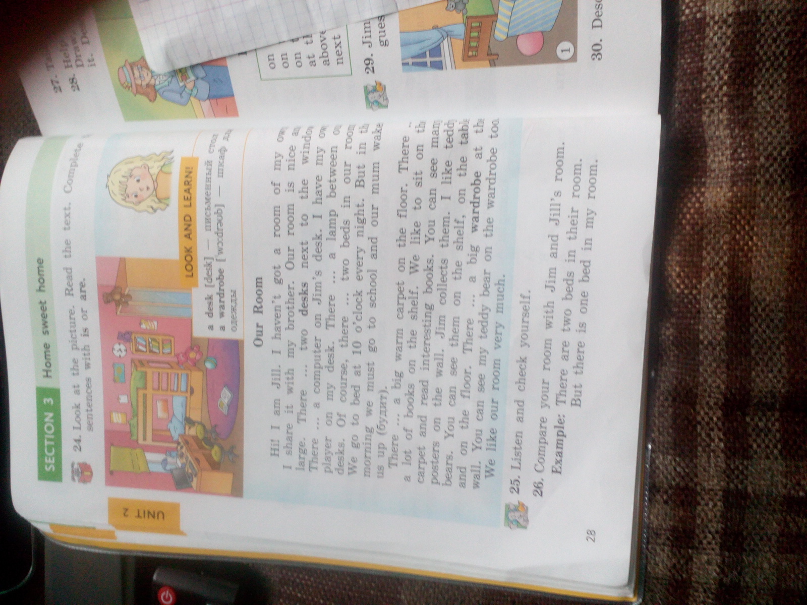 I have a large room. It has a white table with a chair. Every day where I do my homework. There is a window overlooking the street, and close his white curtains. Hanging on the wall white clock. As well, of course, is a cosy and beautiful bed. I have a lot of bookshelves, because I read a lot. On a stand hold a TV