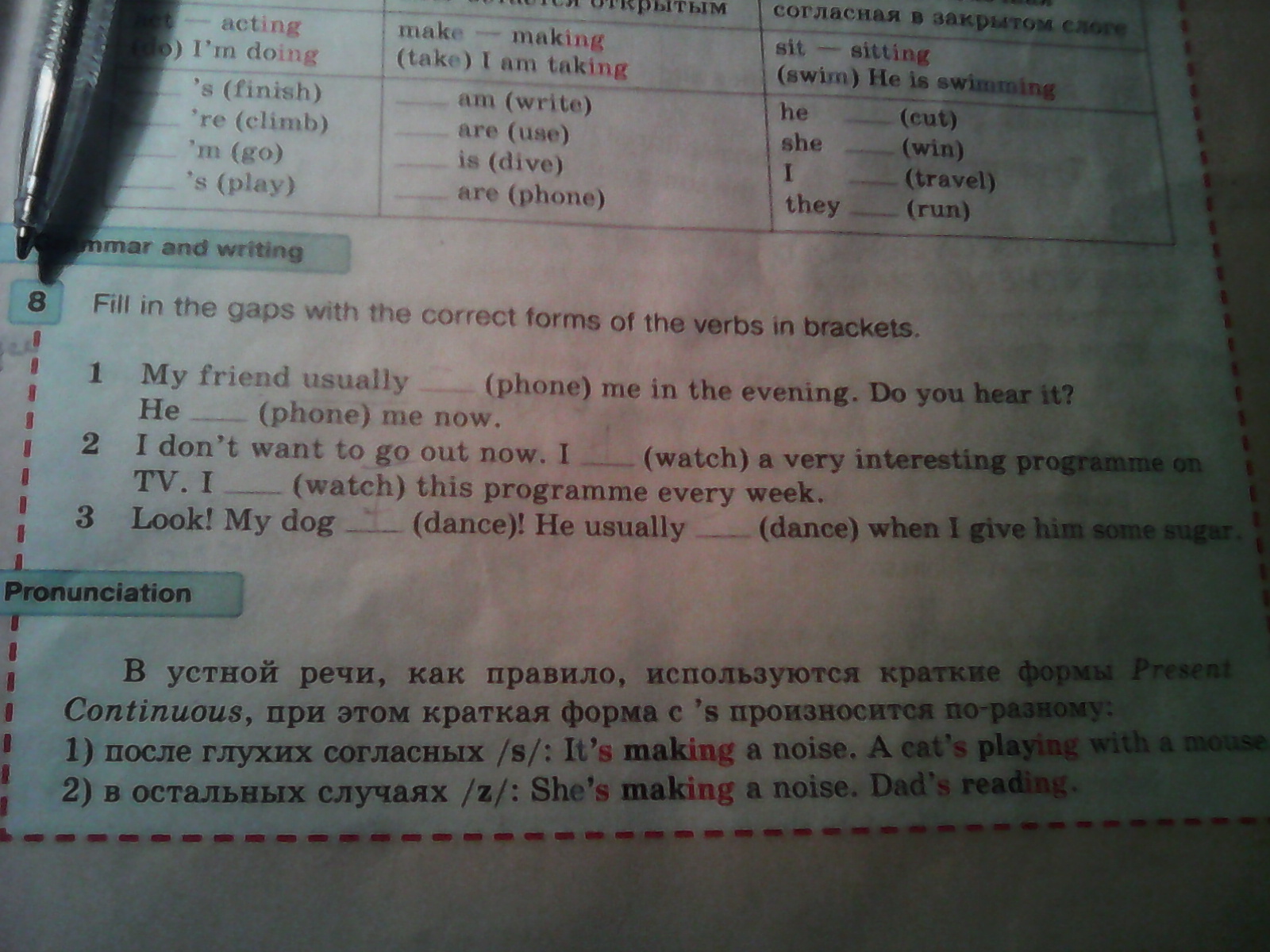 1phones,i s phoning. 2watch watch is 3dancing,dance
