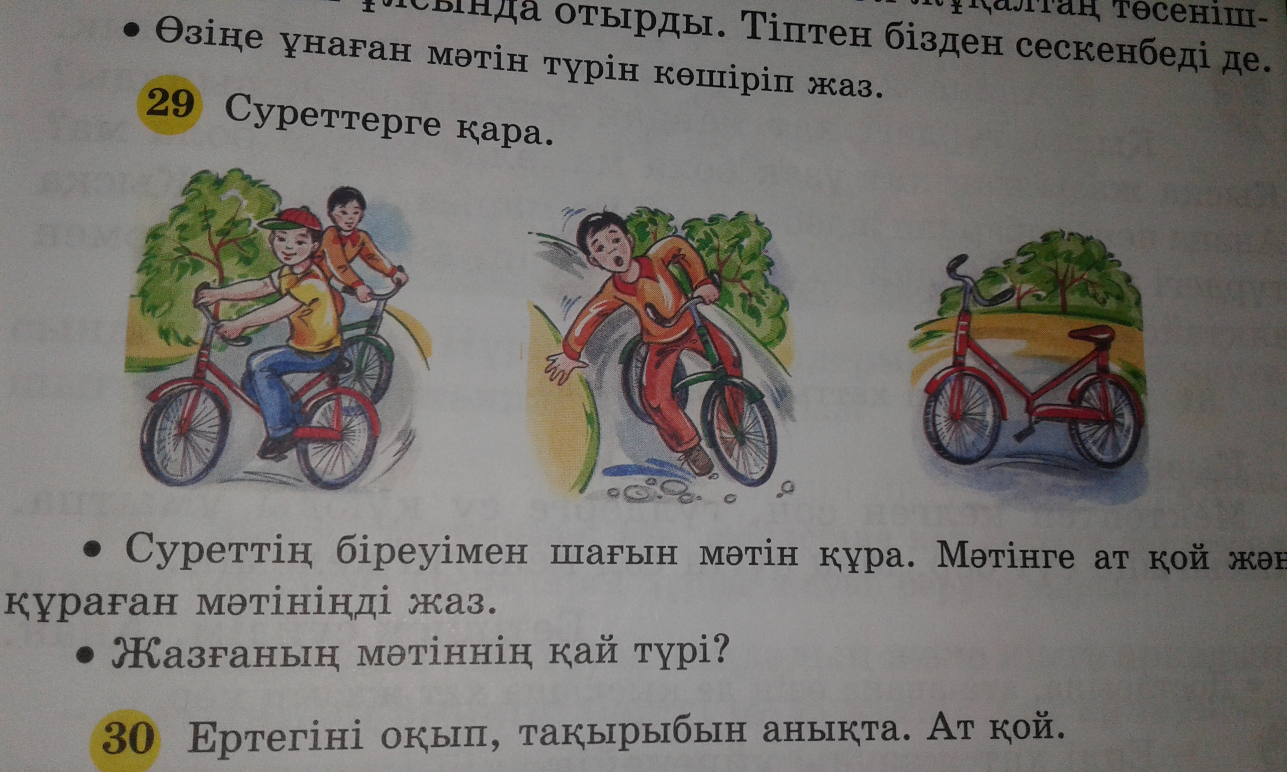 мен досыммен велосипед тебуге шықтым. Жақсы қыдырып қайттым. бір уқытта велосипедтің дөнғалəғы тайып кетті. мен құладым. велосипед сынған жоқ.