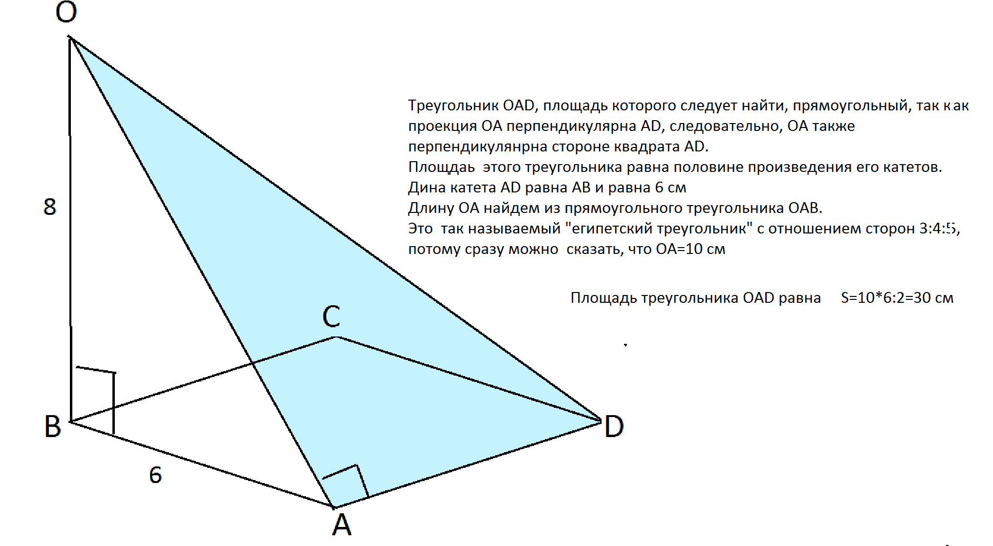 Прямая ОВ перпендикулярна плоскости квадрата ABCD. Вычислите площадь треугольника OAD, если ОВ = 8 см, АВ = 6 см.