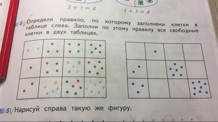 Определите правило,по которому заполнены клетки в таблице слева.Заполни по этому правилу все свободные клетки в двух таблицах.
