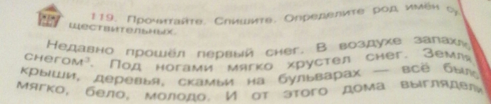 Снег,воздух,бульвар,дом-мужской род.Нога,земля,крыша,скамья-женский род.Дерево-средний род.