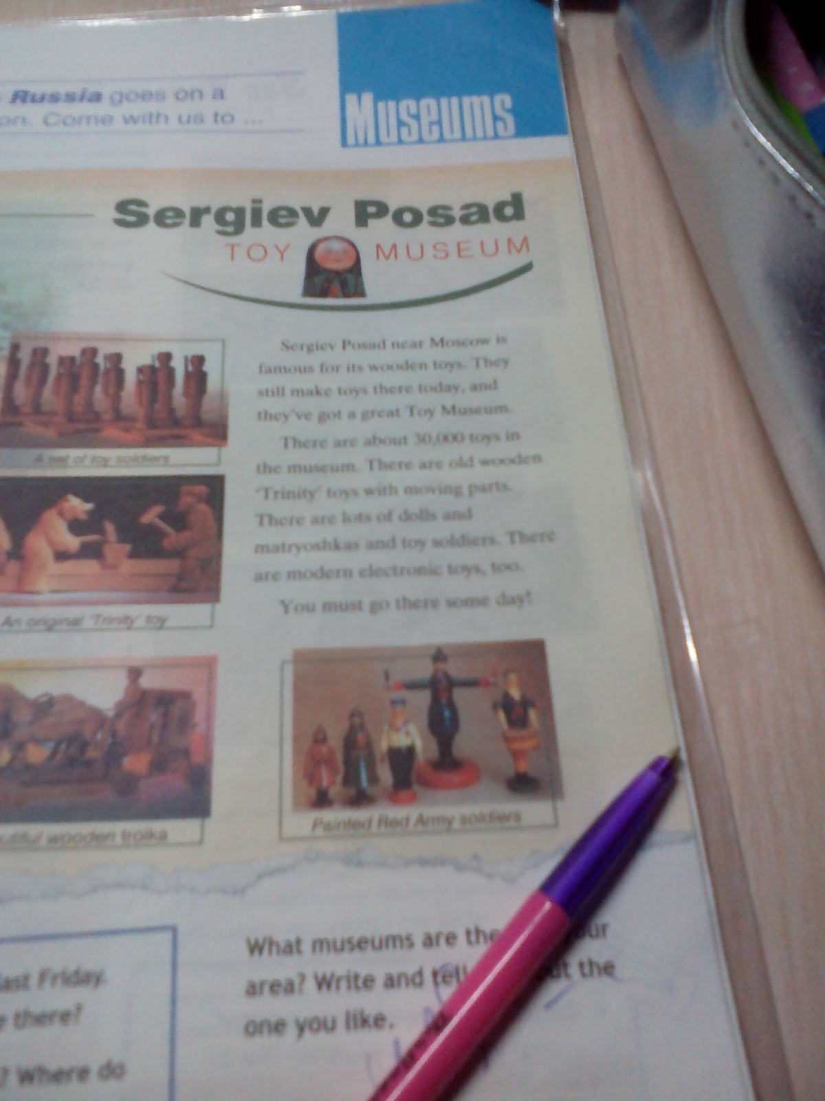 Сергиев Посад рядом с Monerne славится своими деревянными игрушками. Они до сих пор делают там сегодня, у них есть большой тори музей Есть около Manoo в музее. Есть старые деревянные тонн Тринити с движущимися частями Там являются головные уборы Долин и matryoshkan и солдатики Там современные электронные игрушки тоже Вы должны ро там wome dayt