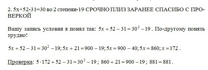 5x+52-31=30 во 2 степени-19 СРОЧНО ПЛИЗ ЗАРАНЕЕ СПАСИБО С ПРОВЕРКОЙ