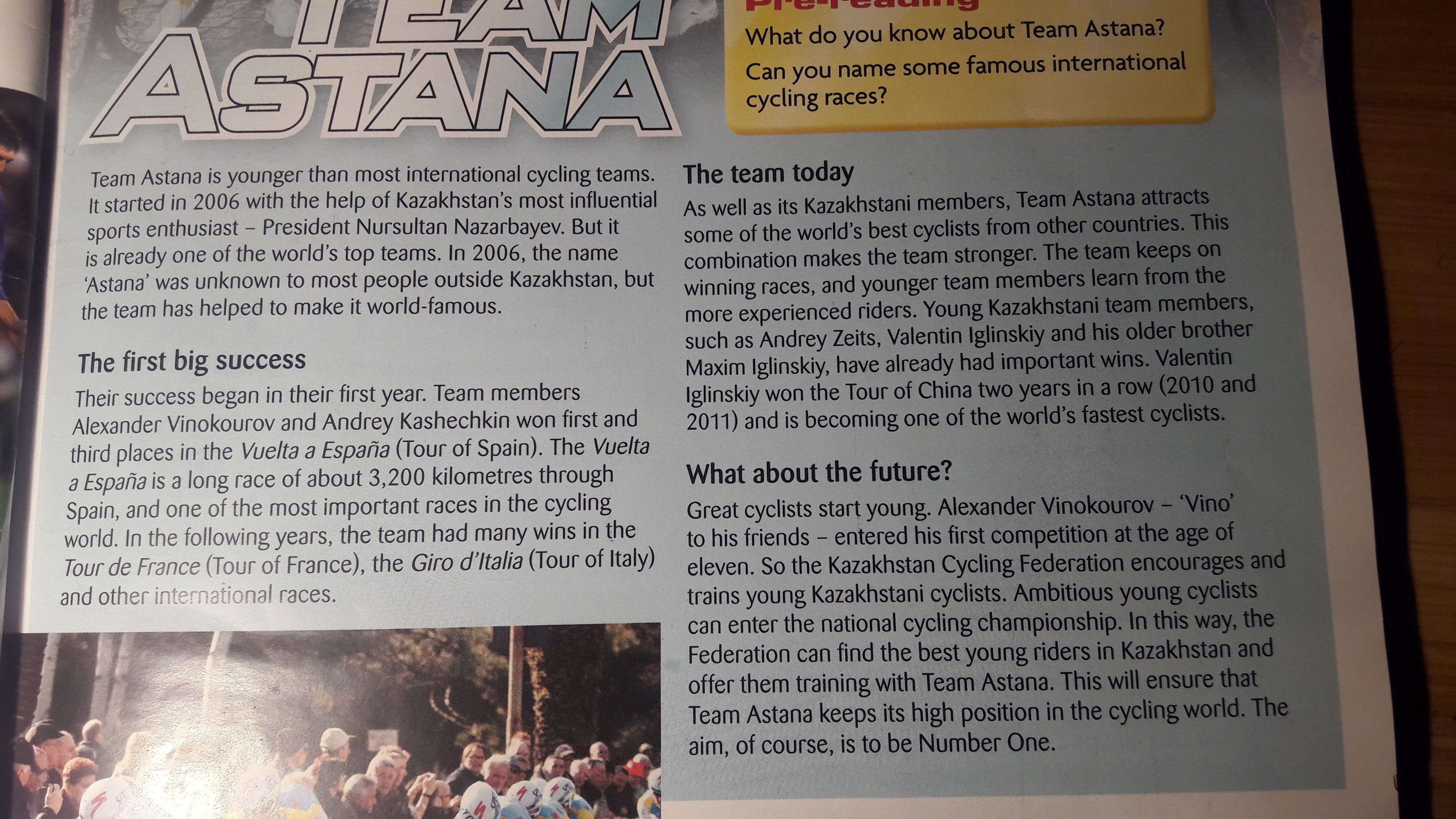 Что вы знаете о Команде Астаны? Можете ли вы назвать несколько известных международных велогонок? Команда Астаны моложе, чем большинство internatonalcycling команд. Команда сегодня началась в 2006 году с помощью Казахстан наиболее влиятельных в качестве своих членов казахстанской. Команда Астана привлекает энтузиастов спорта президент Nunsultan Назарбаев, а также лучшие велосипедисты мира из других стран. Это некоторые из уже является одной из лучших команд в мире. В названии Астана была неизвестна 2006 комбинация делает команду сильнее. Команда сохраняет для большинства людей за пределами Казахстана, но выигрывать гонки, и более молодых членов команды узнать из команды помогла сделать его всемирно известным. более опытные всадники. Молодые члены команды Karakhstani. таких, как Андрей Zeits, Валентин Iginskiy и его старший брат Первый большой успех Максим lglinskiy, уже имели важные победы. Валентин Их успех начался в первый год жизни. Члены команды lglinskiy выиграл Тур Китая два года подряд (2010 и Aleander Винокуров и Андрей Кашечкин выиграл первый и 2011) и становится одним из самых быстрых в мире велосипедистов третье места в Welta Espana (наш Испании). Welta Espana является длинная гонка около 3.200 километров через Что можно сказать о будущем Испании, и один из самых важных гонок в велоспорте Большие велосипедисты начинают молодой, Неандер Винокуров Vino мир. В последующие годы, команда имела много побед в Ио его друзья вошли в его первый конкурс в возрасте Тур де Франс Тур Франция), Giro d'Талию (Тур Италия) одиннадцать. Таким образом, Федерация велосипедного Казахстан поощряет и и другие международные гонки. обучает молодых казахстанских велосипедисты. Амбициозные молодые cyclsts может войти в чемпионат по велоспорту. Таким образом, Федерация может найти лучших молодых nders в Казахстане и предлагают их обучение с командой Астана. Это гарантирует, что команда Астана сохраняет свое высокое положение в мире велоспорта. Цель, конечно, должен быть номер один.