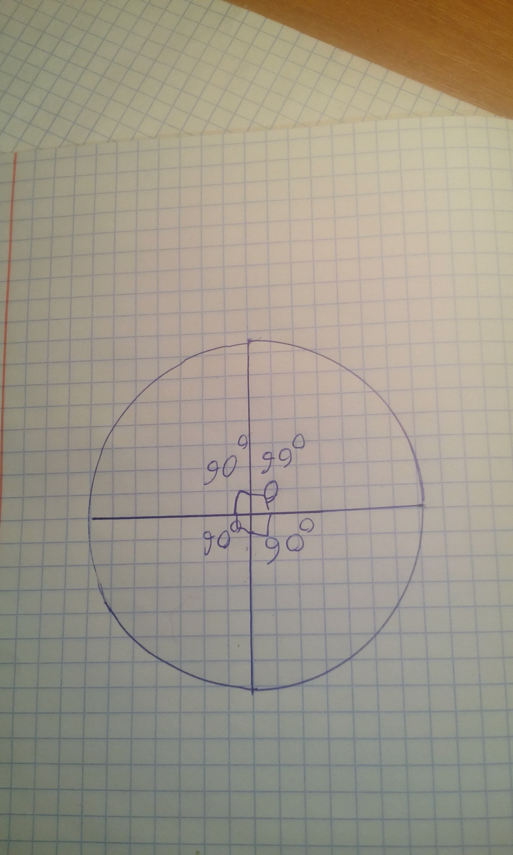 как то так окружность круга равна 360°:4части получим прямой угол равный 90°