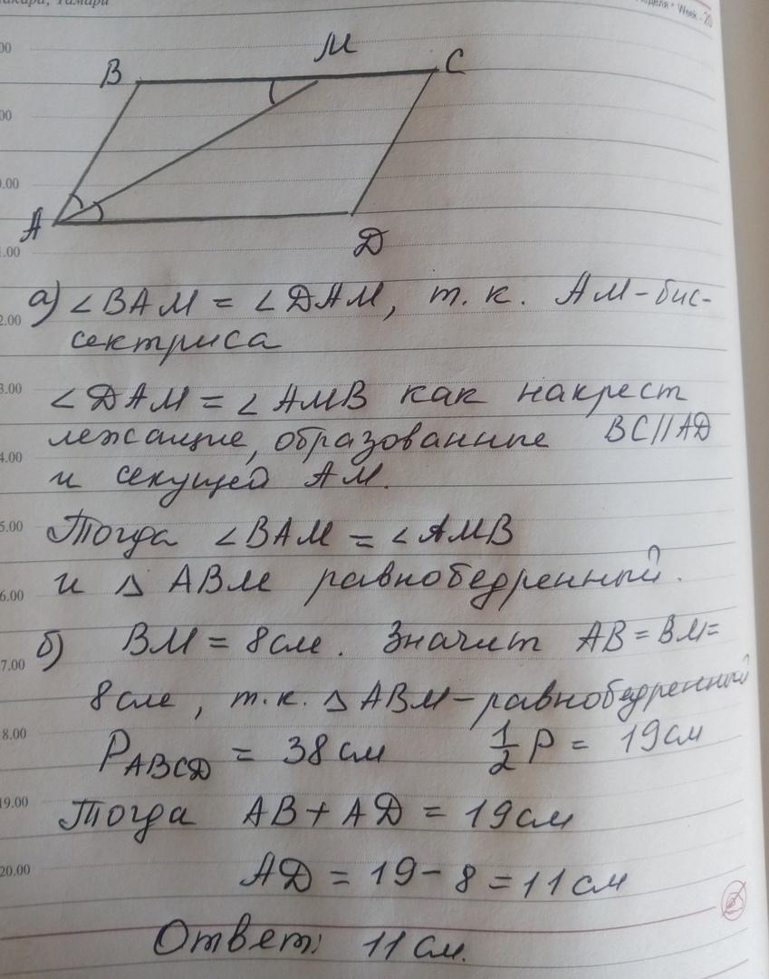 б) Найдите сторону AD, если BM -8см, a периметр параллелограмма равен 38 см.