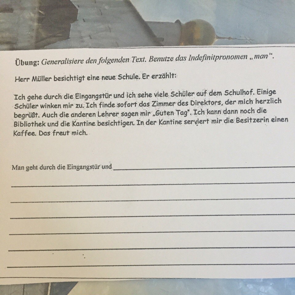 Man geht durch die Eingangstür und sieht viele Schüler auf dem Schulhof. Man winkt mir zu. Man findet sofort das Zimmer des Direktors, der herzlich begrüßt. Man sagt mir Guten Tag. Man kann dann noch die Bibliothek und die Kantine besichtigen. In der Kantine serviert man mir einen Kaffe. Das freut mich.