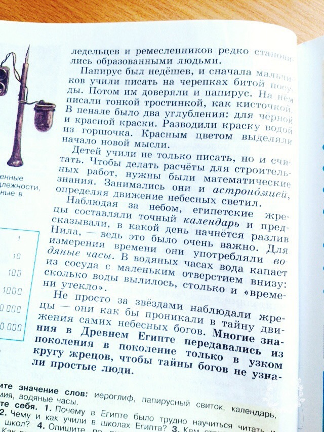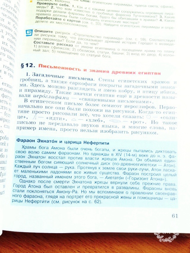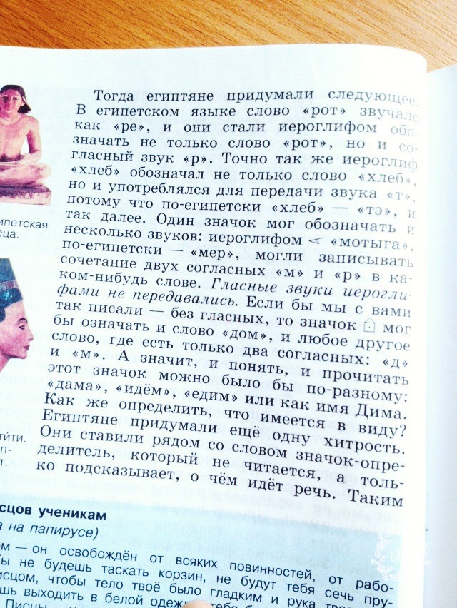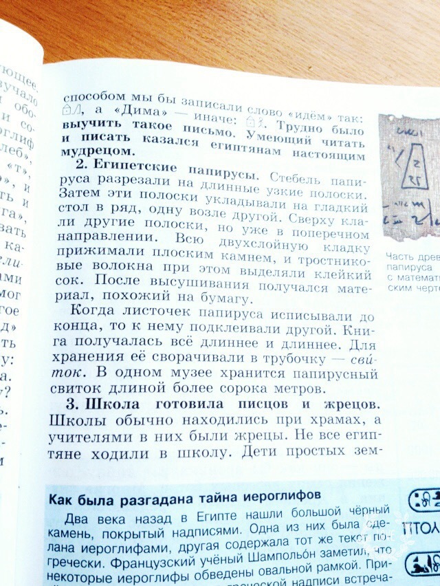 У египтян был очень интересный язык! Ученым было тяжело расшифровать эти слова! Не кто не может заглянуть в прошлое! У них не было букв! У них были знаки! На страницах учебника есть некоторые знаки! К примеру идти, солнце , дом! Не каждый египтянин знал свой язык! Сейчас в школах нас учат писать. Но в в древнем Египте школ не было!