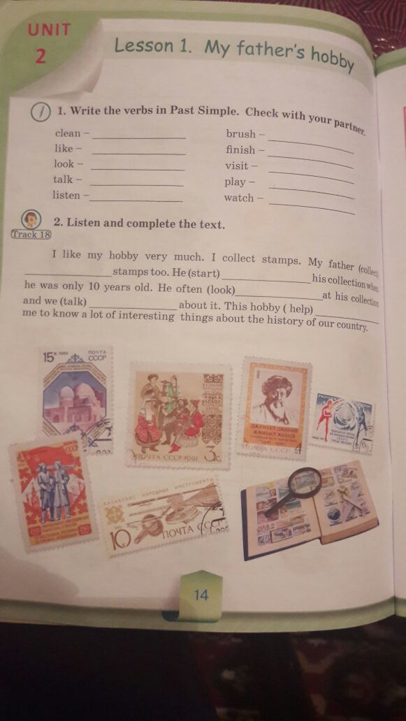 2)первое надо вставить collected,второе startsd,третье looked,4 talked,пятое helped.Я это зделала в школе я тоже в 4классе учусь