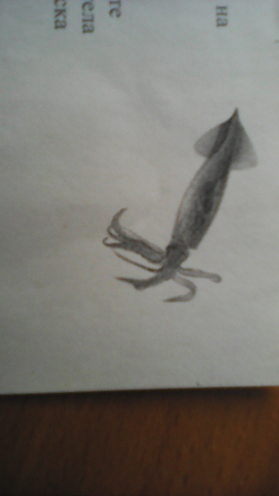 головоногий малюск-кальмар.Признаки класса двусторонняя симметрия и 8,10 щупалец вокруг головы развившихся из ноги малюска.головоногие самые совершенные из мвлюсков.