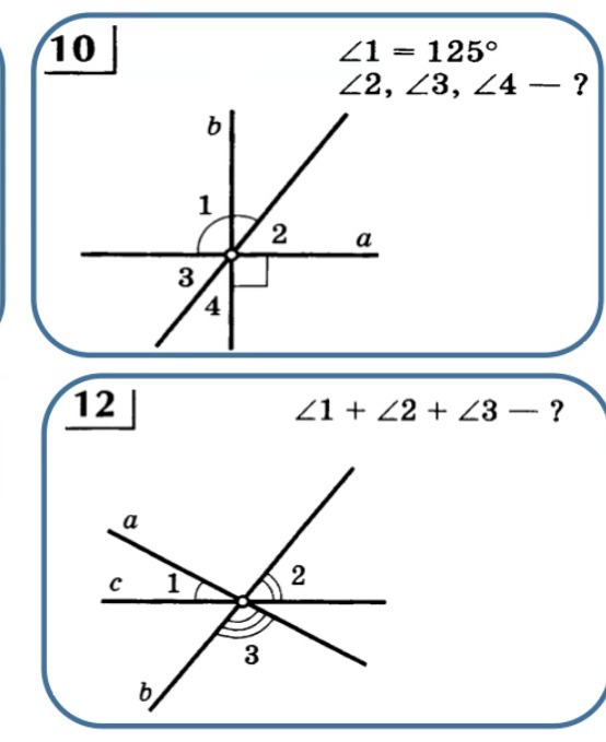 #10. 2= 180-125=55, 3=2=55, 4=180-(55+90)=35. #12. 1+2+3=180.
