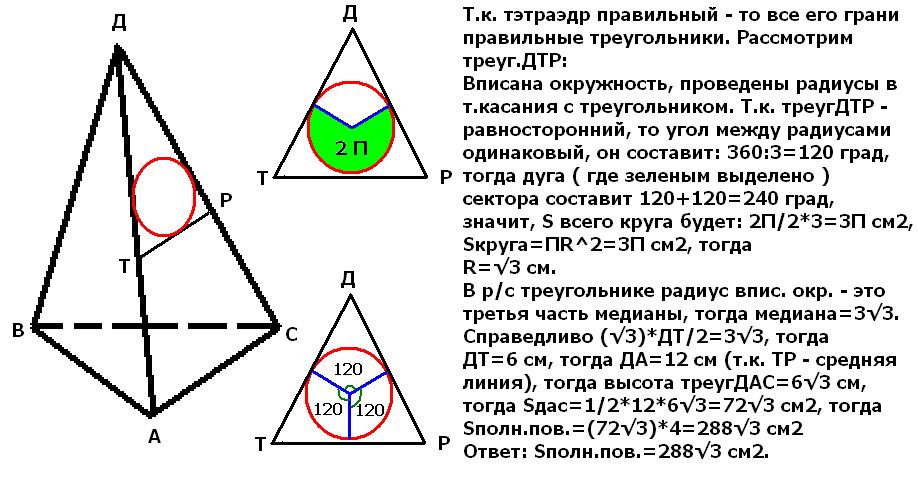 на рисунке изображён правильный тетраэдр DABC . Точки P и T - середины рёбер DC и DA соответственно. В треугольник DTP вписана окружность . Площаь сектора, ограниченного двумя радиусами,проведёнными в точки касания, и дугой окружности,большей 180 градусов,равна 2π см(2).Вычислите площадь боковой поверхности тетраэдра.