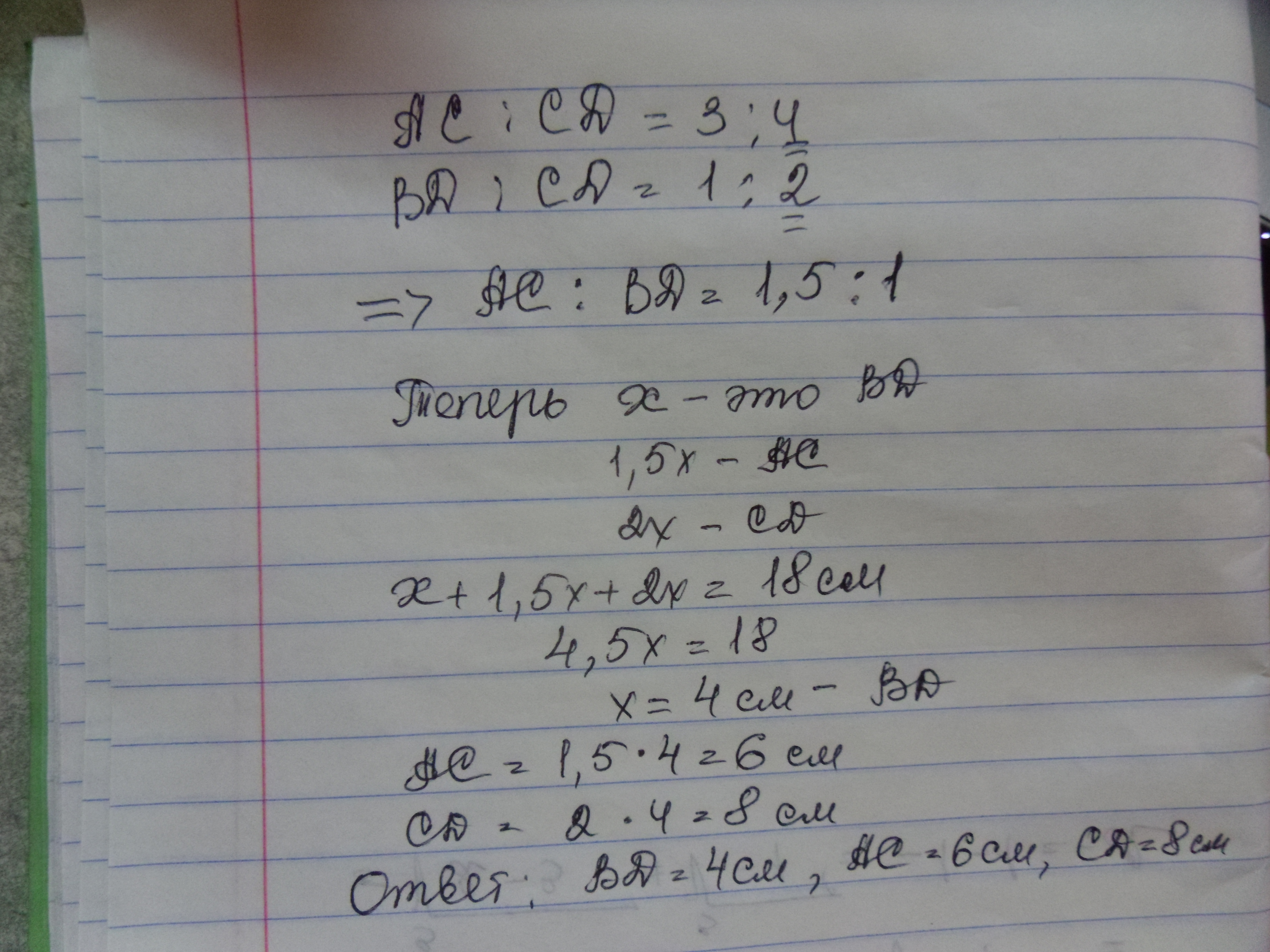 Отрезок AB , длинна которого 18 см , разделён точками C и D на части ,AC:CD=3:4,CD:DB=2:1. Найди длину каждой части