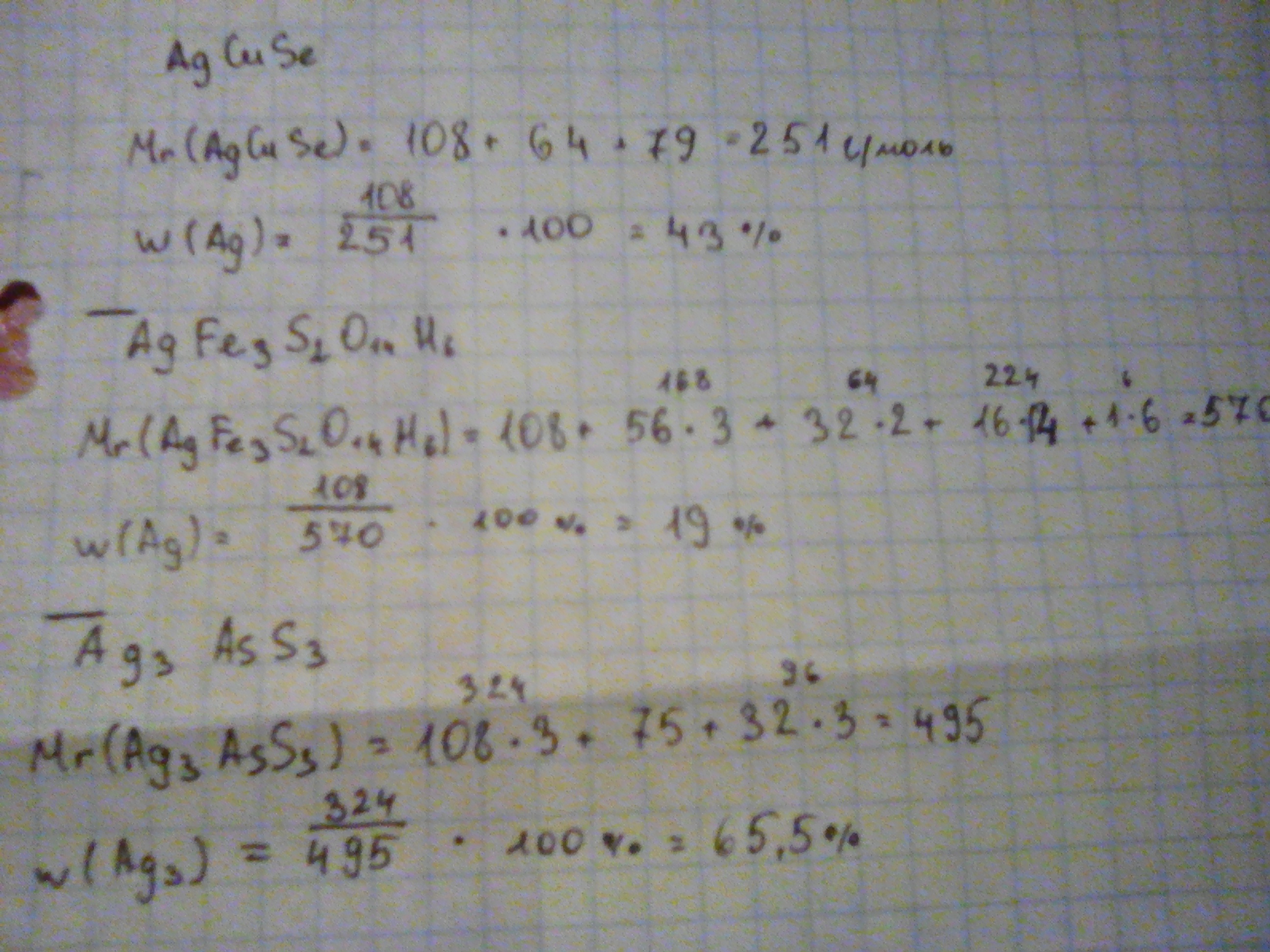 Серебро в природе встречается в виде нескольких минералов. Рассчитайте массовые доли серебра в следующих минералах: AgCuSe; AgFe3S2O14H6; Ag3AsS3.