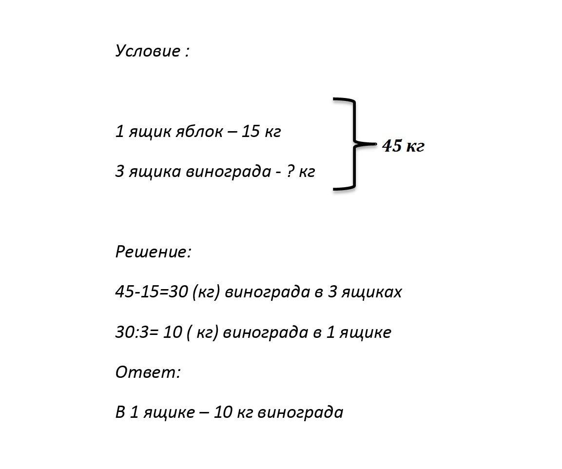 Как составить краткую запись к задачи- Масса ящика с яблоками и трех одинаковых ящиков с виноградом равна 45 кг. Чему равна масса ящика с виноградом если масса ящика с яблоками равна равна 15 кг?