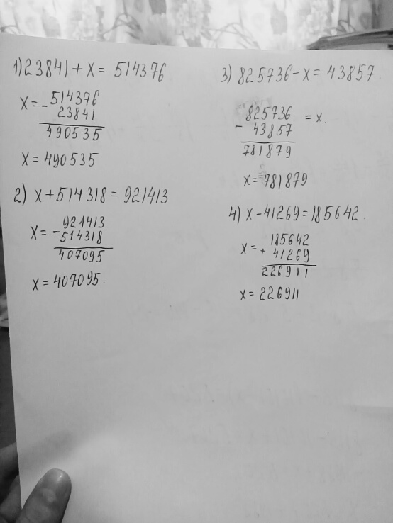вычесли корни следущих уравнений.Вычисления выполни столбиком.1)23841+х=514376.2)х+514318=921413.3)825736-х=43857.4)х-41269=185642.