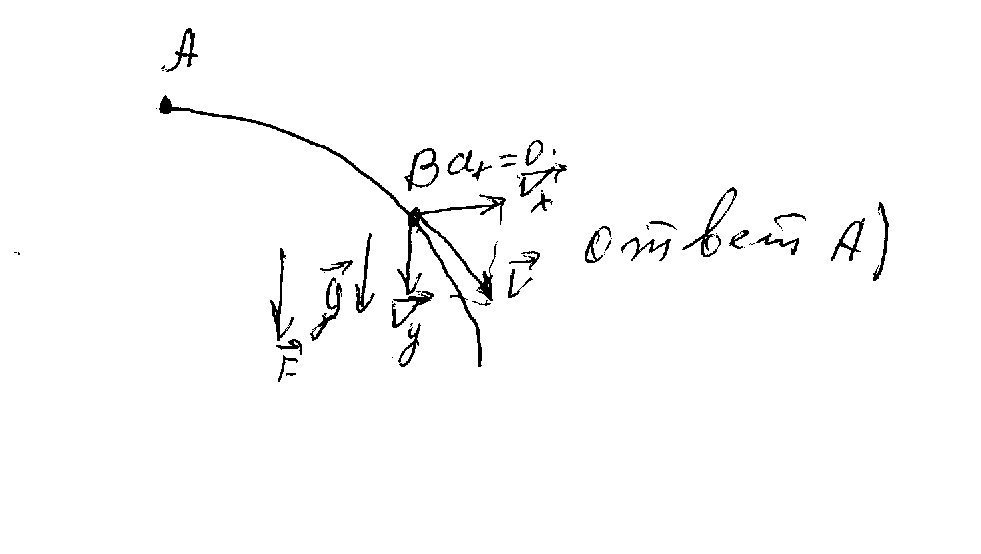 А) Векторы силы и ускоренеия направлены вертикально вниз, вектор скорости направлен по касательной в точке В вниз.