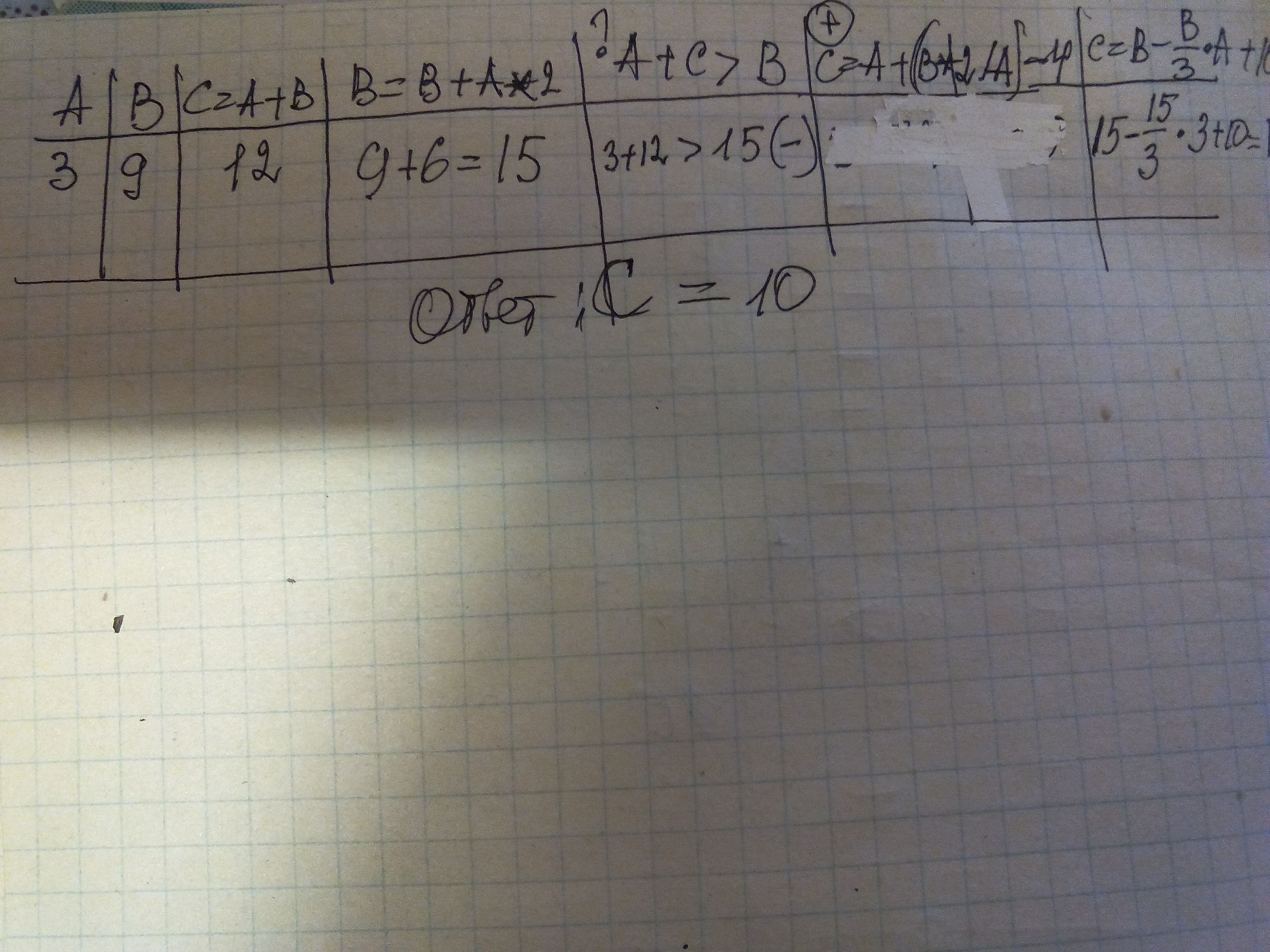 Вычислите, чему равняется значение переменной С, после выполнения следующего алгоритма: А = 3 В = 9 С = А + В В = В + А * 2 если А + C > B то С = А + В * 2 / А - 4 иначе С = В - В / 3 * А + 10