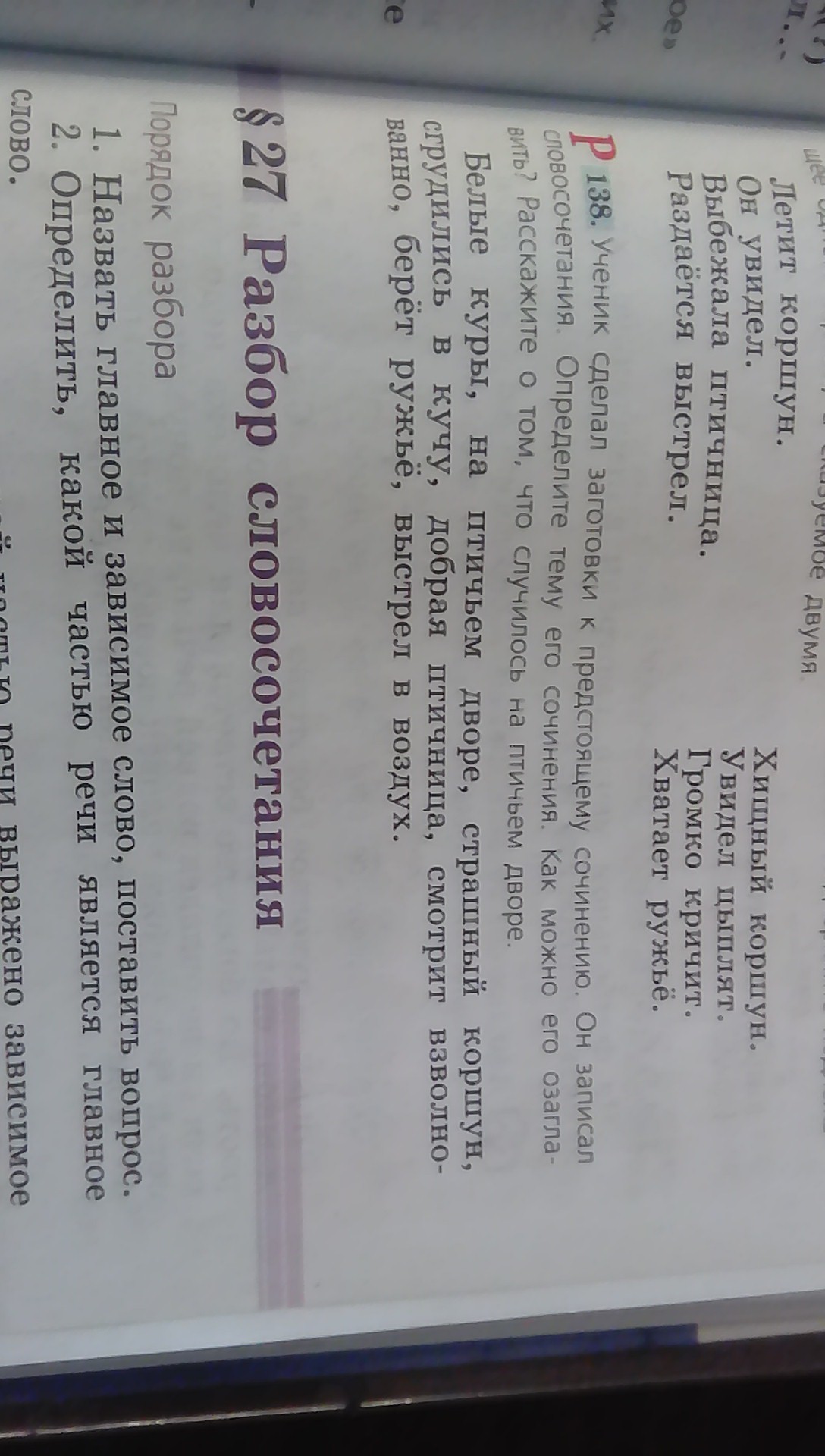 Однажды, добрая птичница выпустила белых кур погулять на птичьем дворе.Стояла прекрасная погода,куры разбежались по всему двору, ничего не предвещало беды, как вдруг появился страшный коршун-он хотел утащить птенца. Куры испугались и сгрудились в кучу. Они увидели как хозяин берет ружье и выходит во двор. Коршун не обращал на него внимания и тогда прогремел выстрел в воздух, коршун испугался и улетел. Птенцы остались живы.