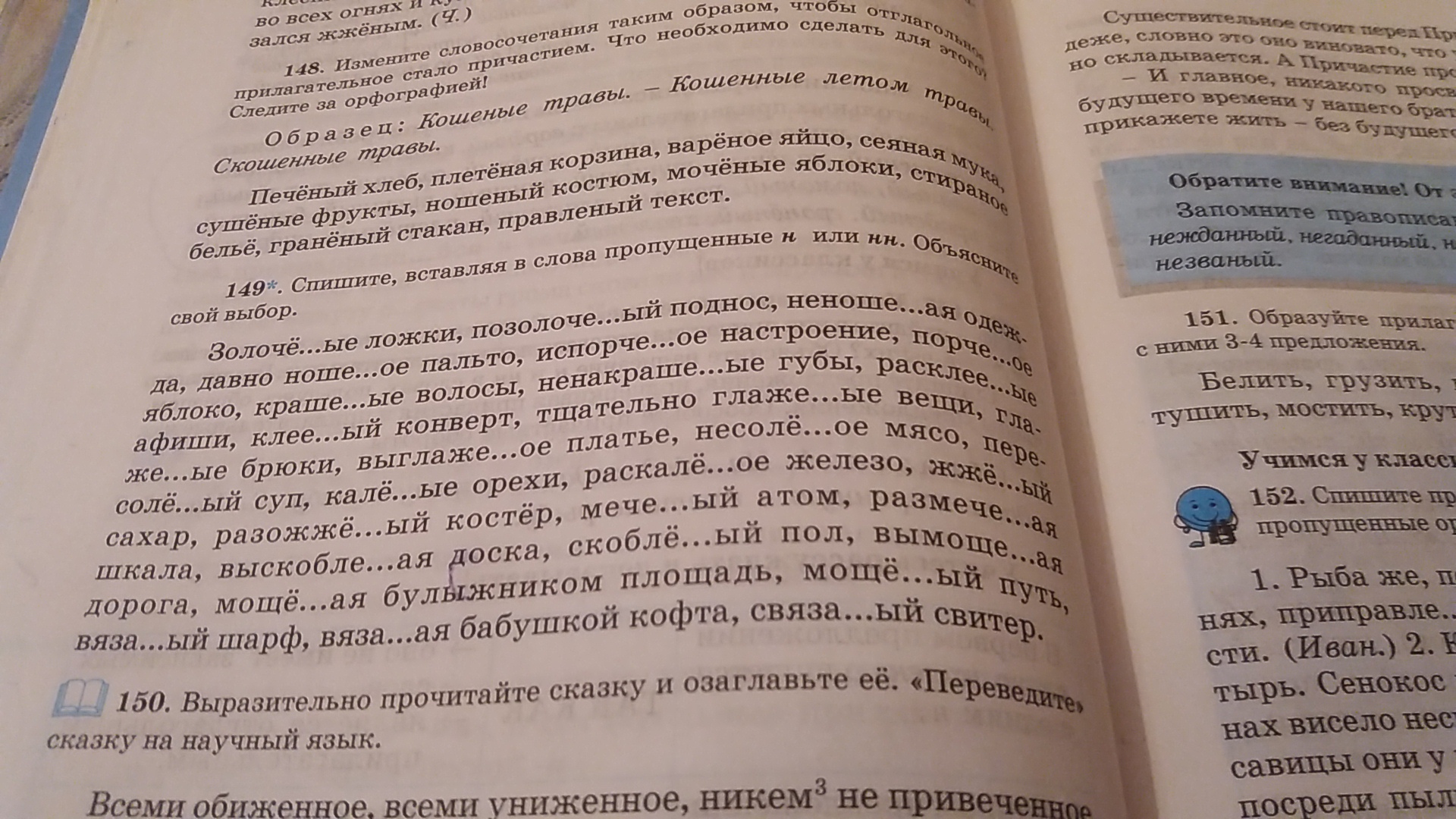 золоченые, позолоченный, неношеная, ношенное, испорченное, порченное, крашеные, ненакрашенные, расклеенные, клееный, глаженные, глаженые, выглаженное,несоленое, пересоленный, калёные, раскалённое, жжёный, разожжённый, меченый, размеченная, выскобленная, скобленный, вымощенная, мощёная, мощёный, вязаный, вязанная, связанный.