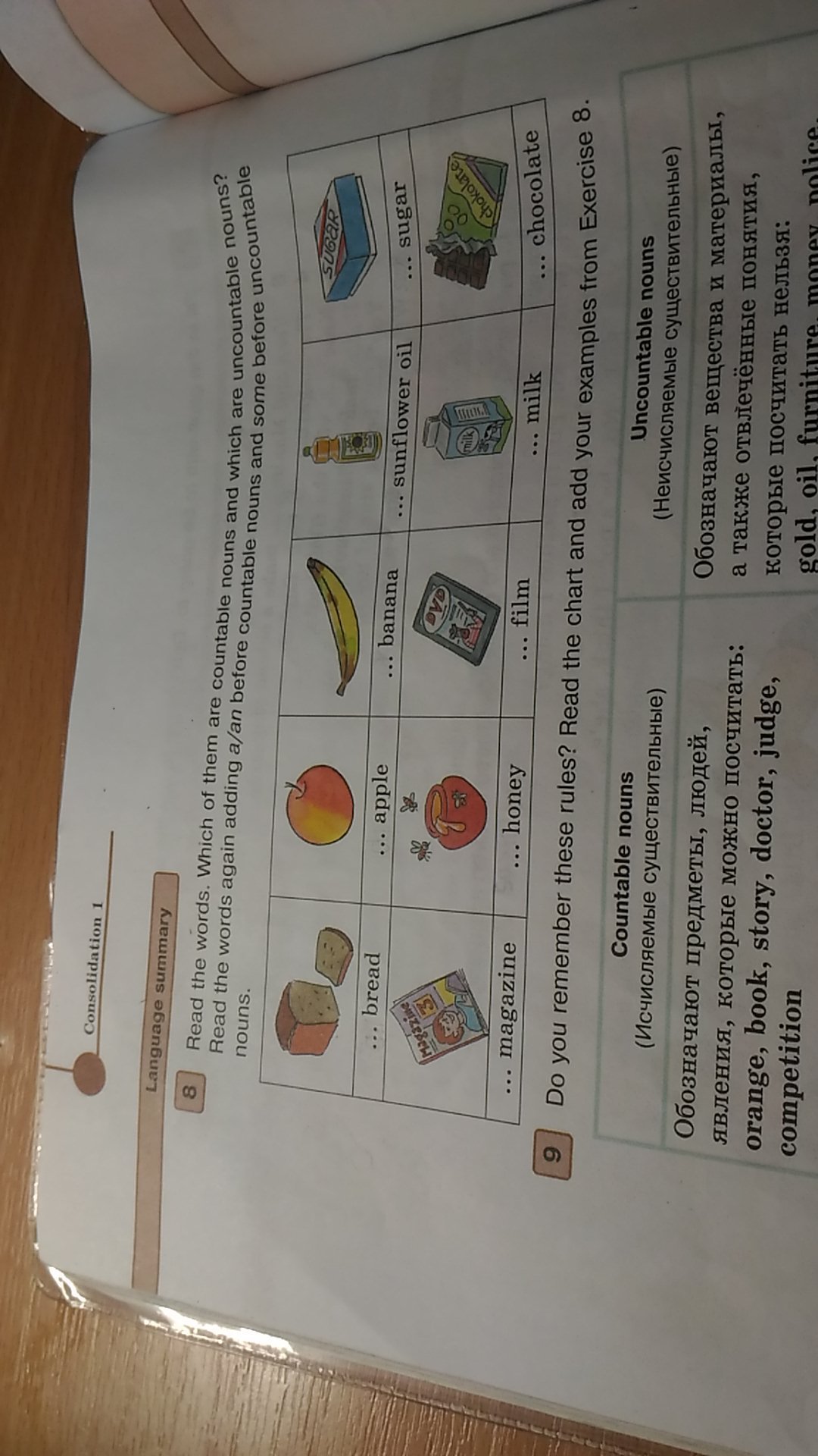 Some bread(a slice of bread), an apple, a banana, some sunflower oil, some sugar, a magazine, some honey, a film, some milk, some chocolate( a bar of chocolate)