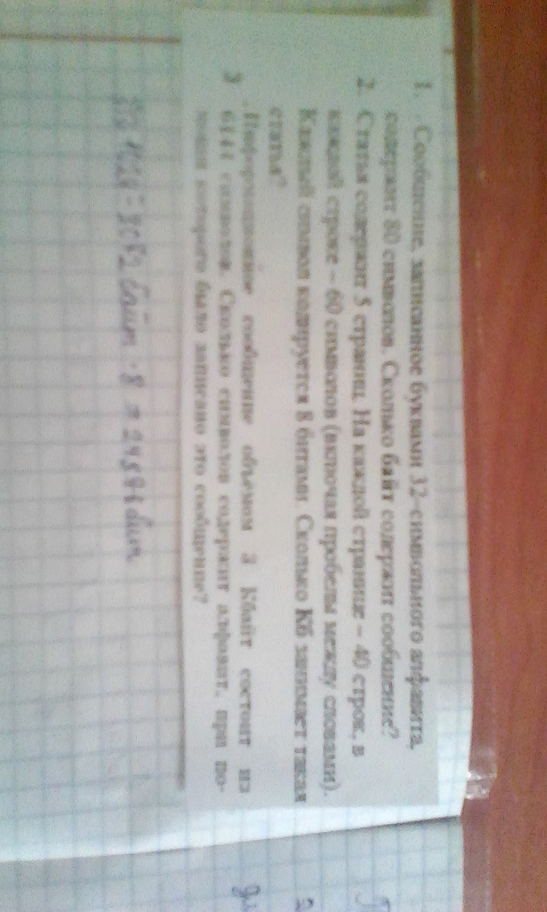 1)сообщение записанное буквами 32-символьного алфавита содержит 80 символов. Сколько байт содержит сообщение?