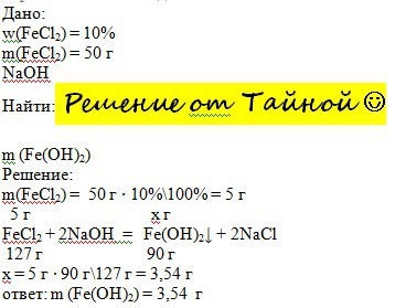 К 50г раствора, содержащего 10% хлорида железа (II), добавили гидроксид натрия. Вычислите массу образовавшегося осадка.