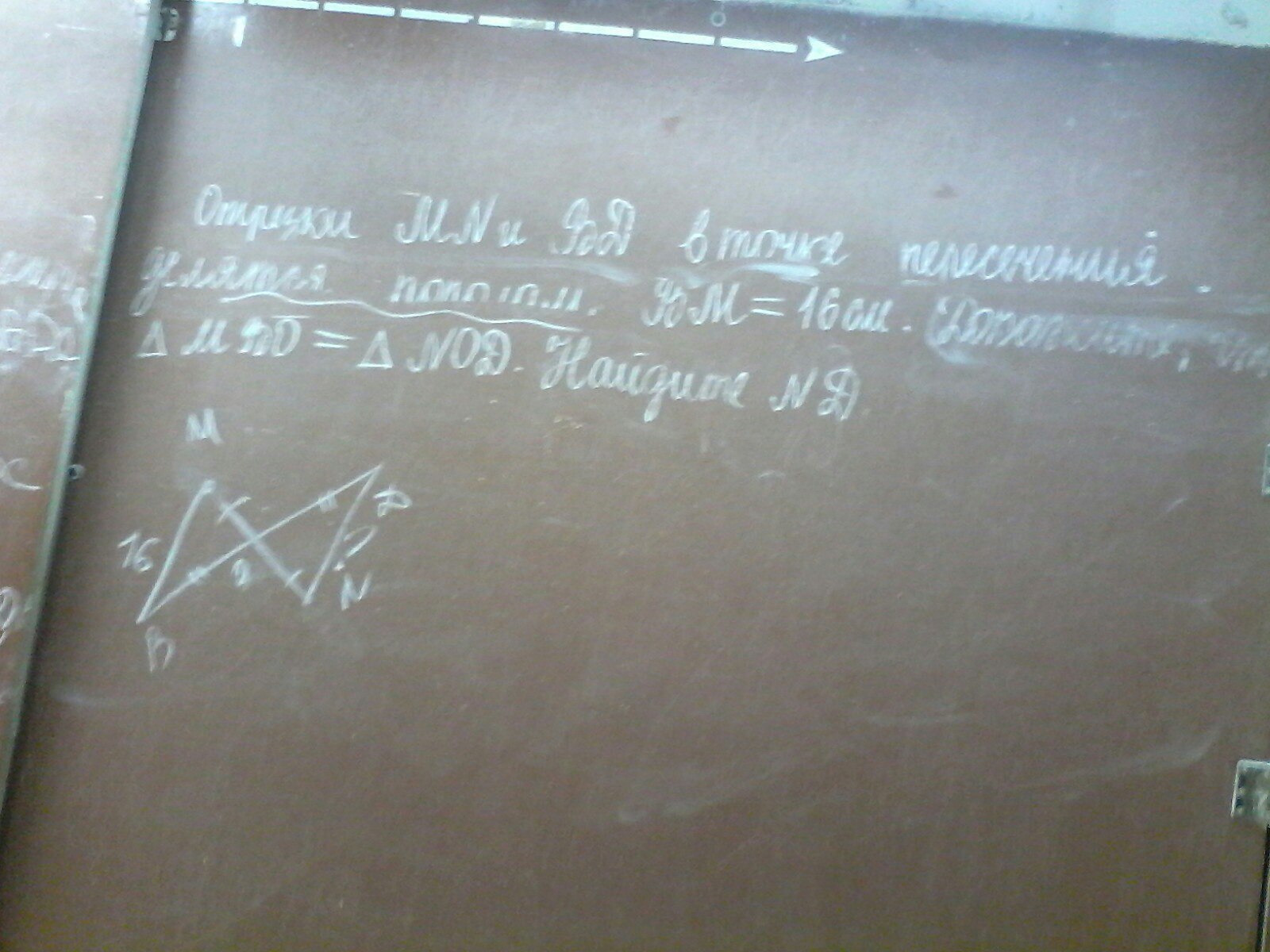 ∆МОВ=∆НОД (по 1 признаку), т.к. угол МОВ = углу НОД как вертикальные; МО=ОН, ВО=ОД . Следовательно МВ=НД=16см
