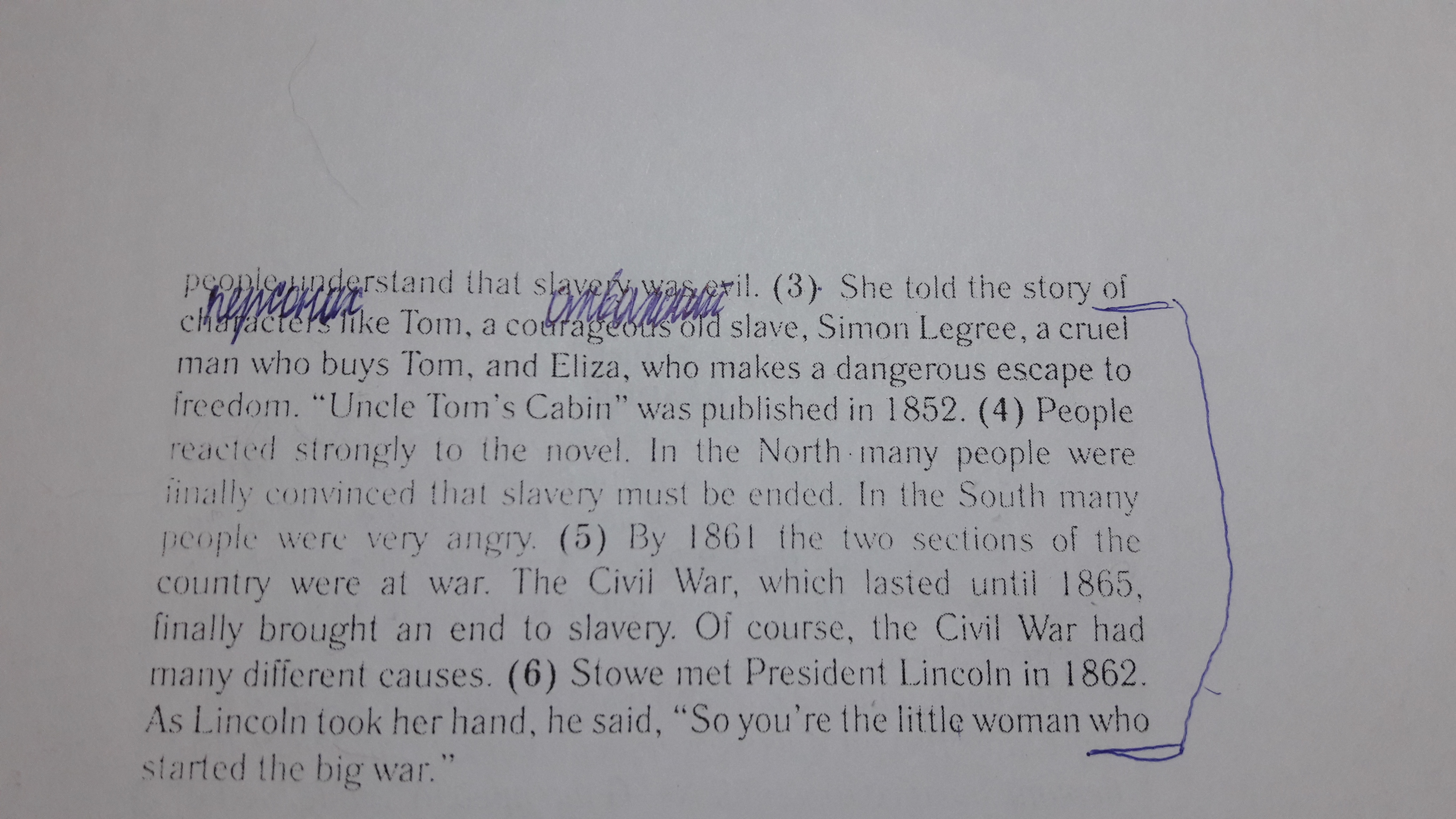 Она рассказала историю таких персонажей, как Том, отважный старый раб, Саймон Легри, жестокий мужчина, который купил Тома, и Элиза, которая совершает опасный побег на свободу. "Хижина дяди Тома" была опубликована в 1852. Люди остро отреагировали на новеллу. На севере многие люди были наконец-то убеждены, что с рабством должно быть покончено. На юге многие люди были очень агрессивны. К 1861 году две части страны воевали. Гражданская война, которая длилась до 1865, наконец положила конец рабству. Конечно, у гражданской войны было много причин. Стоу встретила президента Линкольна в 1862. Как только Линкольн взял ее руку, он сказал: "Так Вы маленькая женщина, начавшая большую войну".