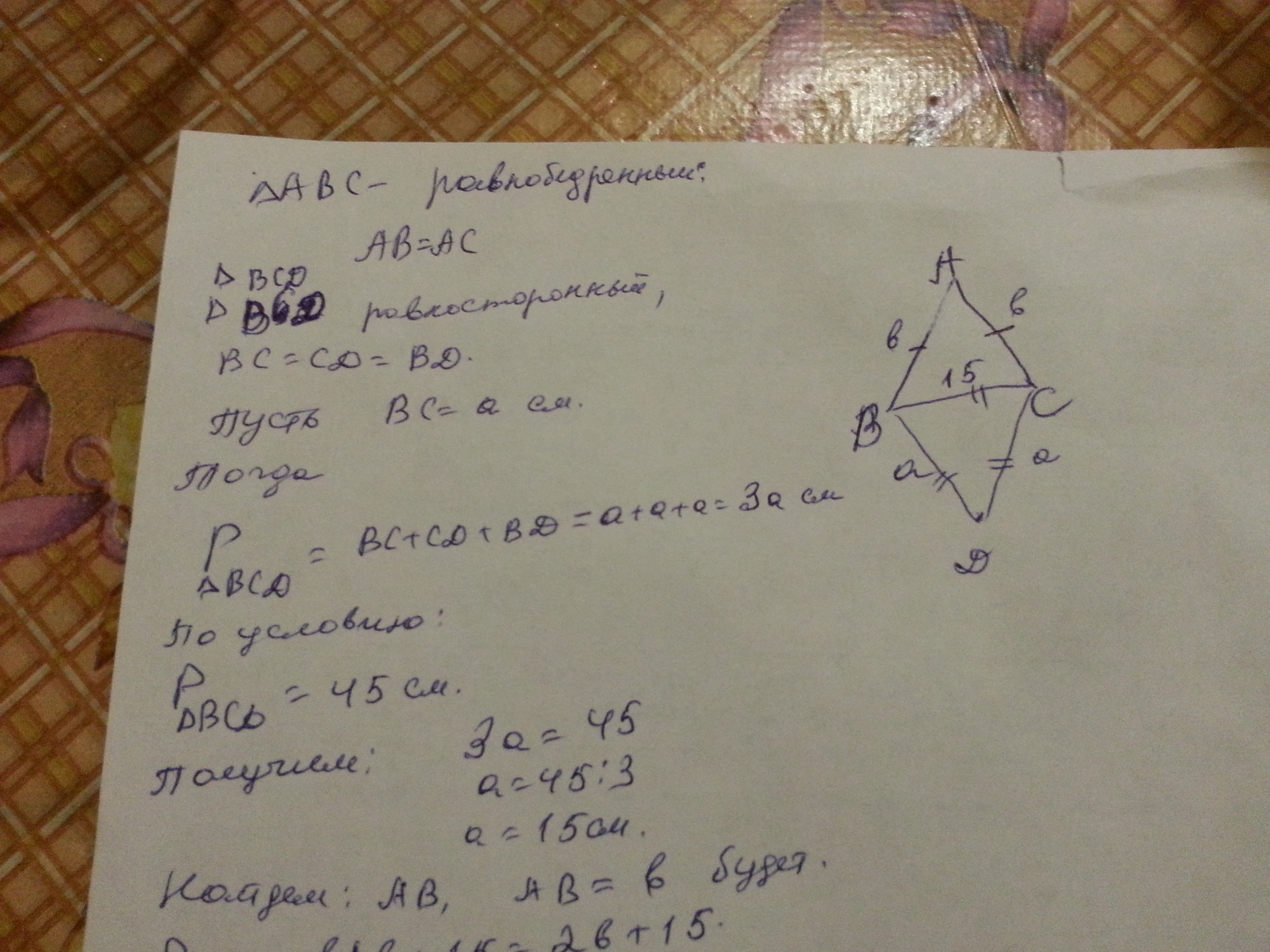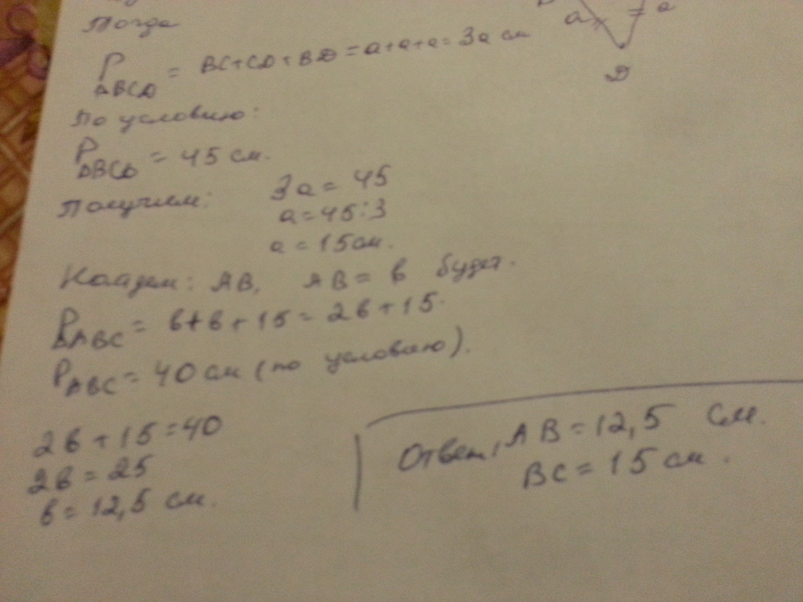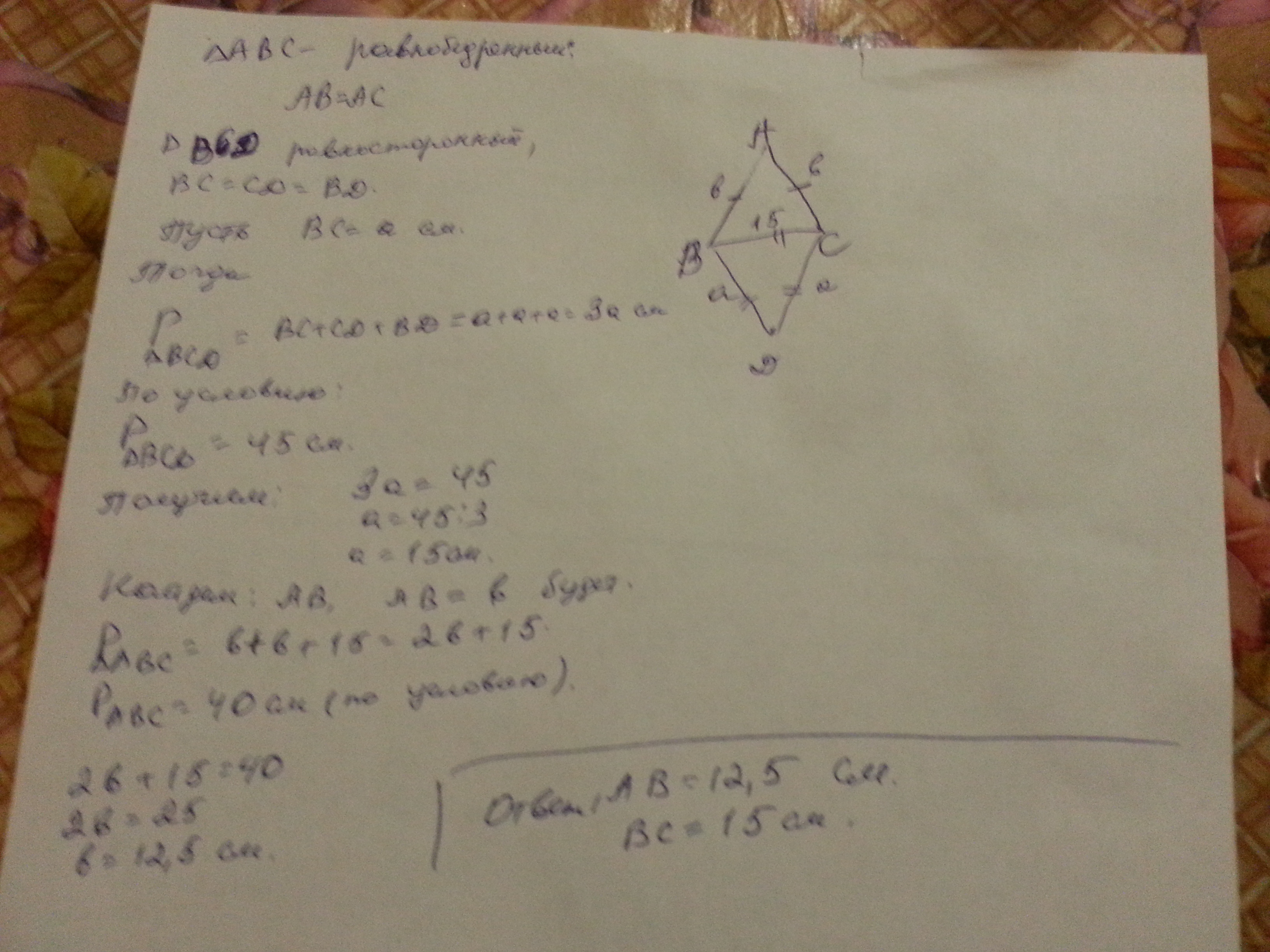 Периметр равнобедренного треугольника АВС с основанием ВС равен 40см,а периметр равностороннего треугольника ВDC равен 45см.Найдите стороны АВ и ВС.
